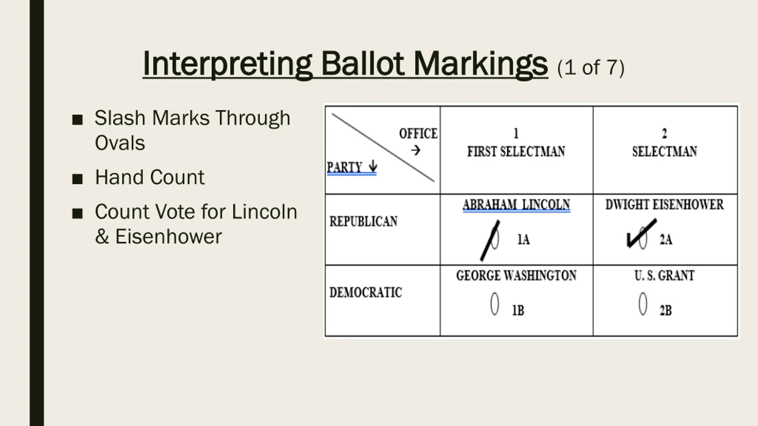Interpreting Ballot Markings Interpreting Ballot Markings (1 of 7) Slash Marks Through Ovals Hand Count Count Vote for Lincoln & Eisenhower