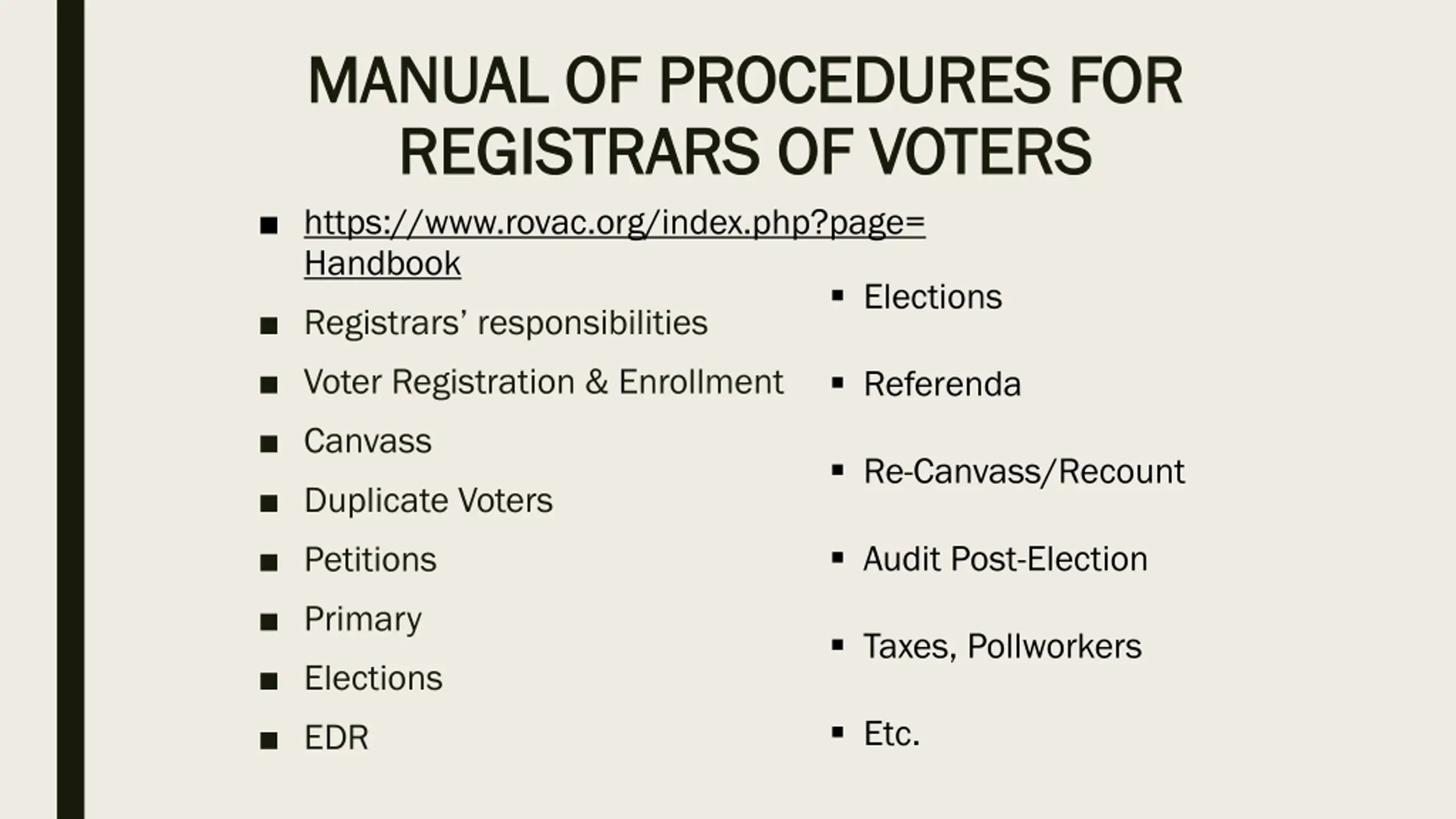 MANUAL OF PROCEDURES FOR MANUAL OF PROCEDURES FOR REGISTRARS OF VOTERS REGISTRARS OF VOTERS https://www.rovac.org/index.php?page= Handbook Registrars responsibilities Voter Registration & Enrollment Canvass Duplicate Voters Petitions Primary Elections EDR Elections Referenda Re-Canvass/Recount Audit Post-Election Taxes, Pollworkers Etc.