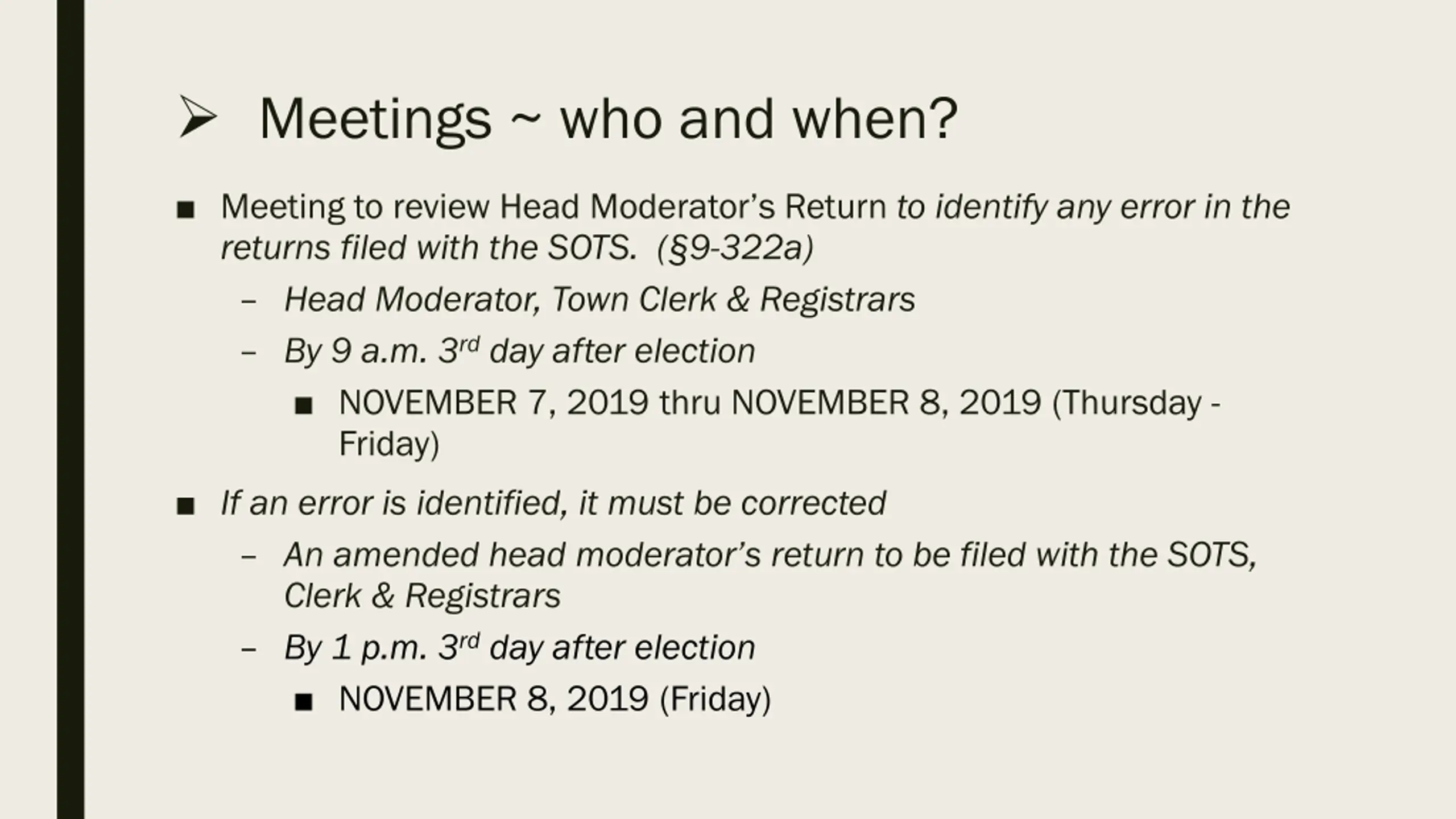 Meetings ~ who and when? Meeting to review Head Moderator s Return to identify any error in the returns filed with the SOTS. ( 9-322a) Head Moderator, Town Clerk & Registrars By 9 a.m. 3rd day after election NOVEMBER 7, 2019 thru NOVEMBER 8, 2019 (Thursday - Friday) If an error is identified, it must be corrected An amended head moderator s return to be filed with the SOTS, Clerk & Registrars By 1 p.m. 3rd day after election NOVEMBER 8, 2019 (Friday)