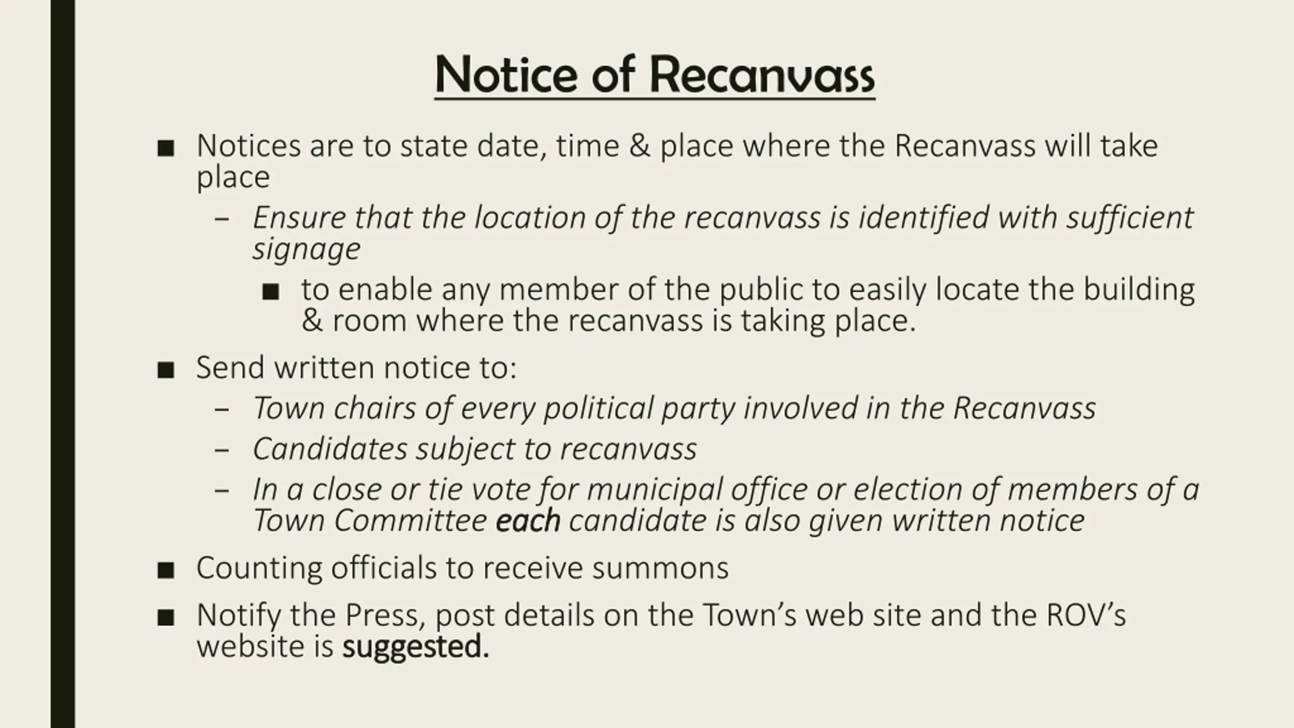 Notice of Recanvass Notices are to state date, time & place where the Recanvass will take place Ensure that the location of the recanvass is identified with sufficient signage to enable any member of the public to easily locate the building & room where the recanvass is taking place. Send written notice to: Town chairs of every political party involved in the Recanvass Candidates subject to recanvass In a close or tie vote for municipal office or election of members of a Town Committee each each candidate is also given written notice Counting officials to receive summons Notify the Press, post details on the Town s web site and the ROV s website is suggested. suggested.