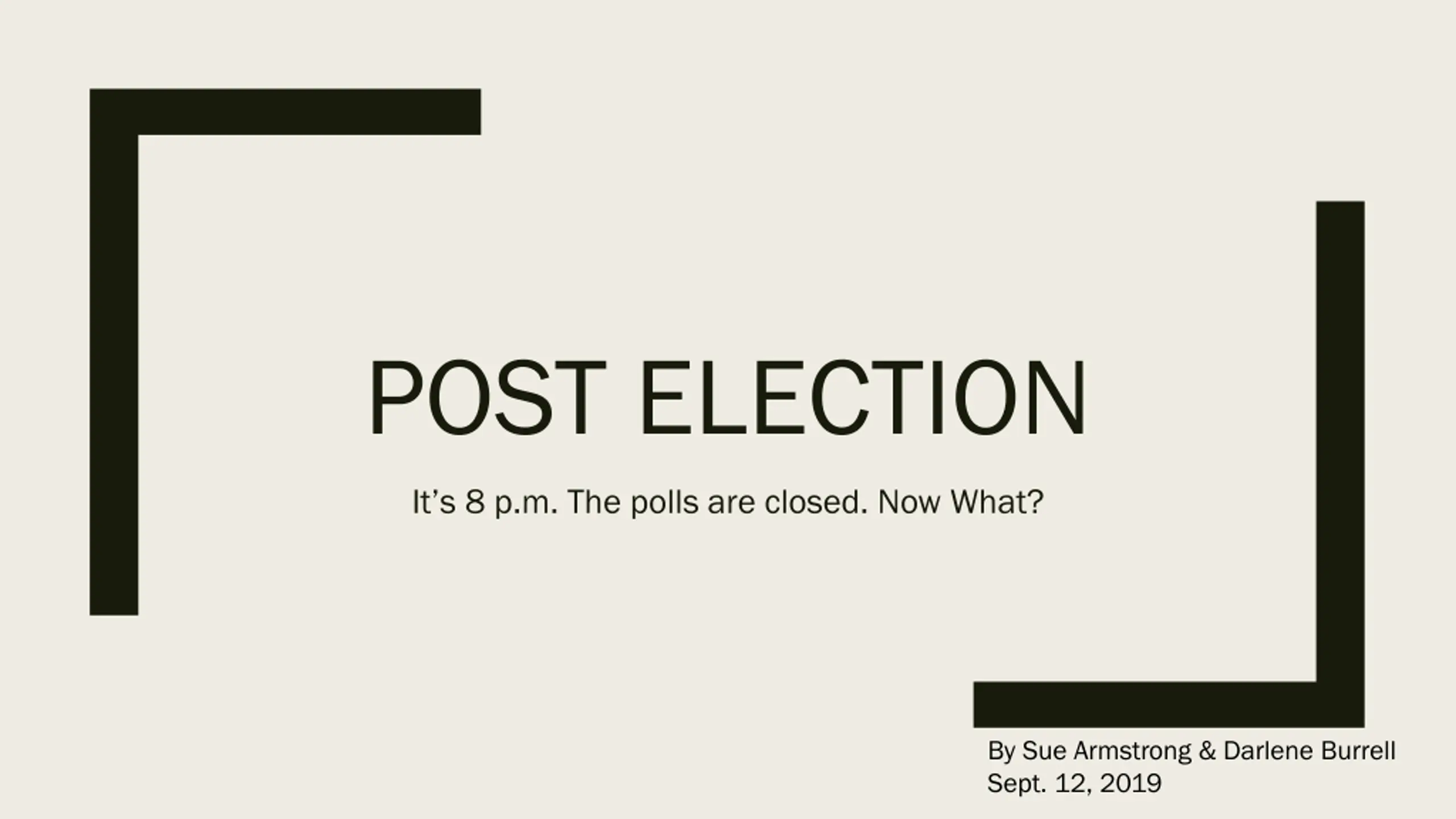 POST ELECTION It s 8 p.m. The polls are closed. Now What? By Sue Armstrong & Darlene Burrell Sept. 12, 2019