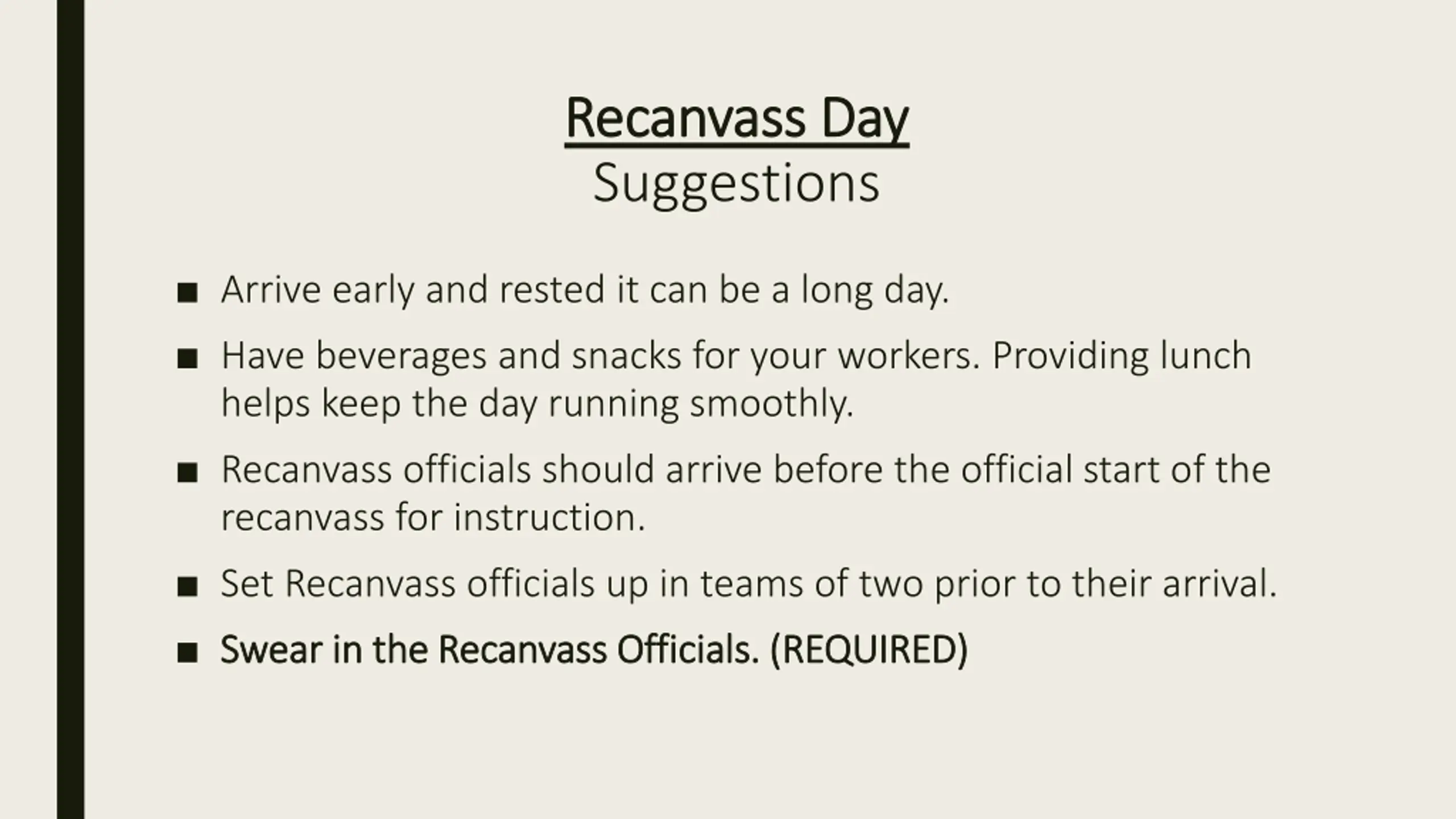Recanvass Day Recanvass Day Suggestions Arrive early and rested it can be a long day. Have beverages and snacks for your workers. Providing lunch helps keep the day running smoothly. Recanvass officials should arrive before the official start of the recanvass for instruction. Set Recanvass officials up in teams of two prior to their arrival. Swear in the Recanvass Officials. (REQUIRED) Swear in the Recanvass Officials. (REQUIRED)