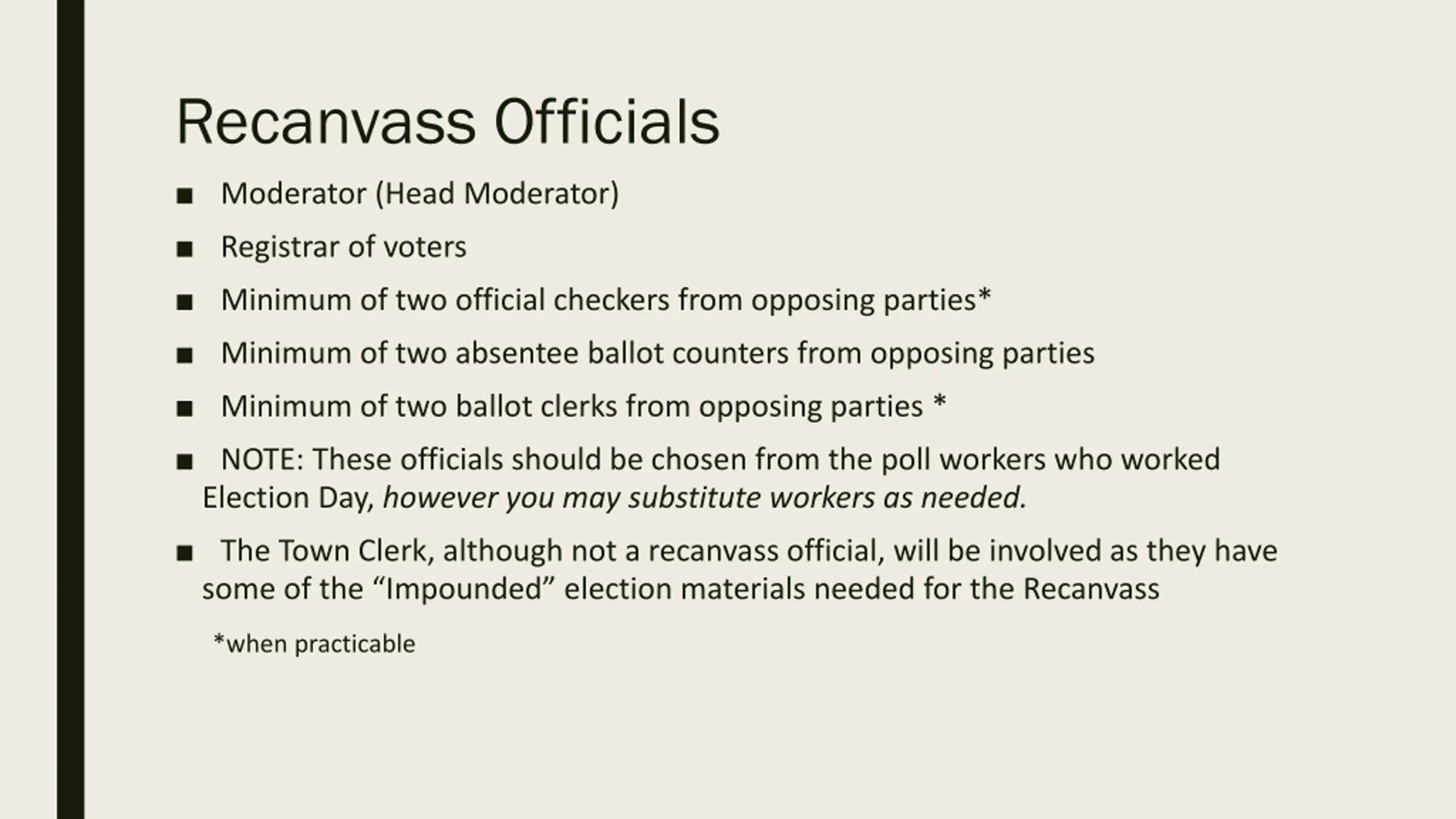 Recanvass Officials Moderator (Head Moderator) Registrar of voters Minimum of two official checkers from opposing parties* Minimum of two absentee ballot counters from opposing parties Minimum of two ballot clerks from opposing parties * NOTE: These officials should be chosen from the poll workers who worked Election Day, however you may substitute workers as needed. The Town Clerk, although not a recanvass official, will be involved as they have some of the Impounded election materials needed for the Recanvass *when practicable