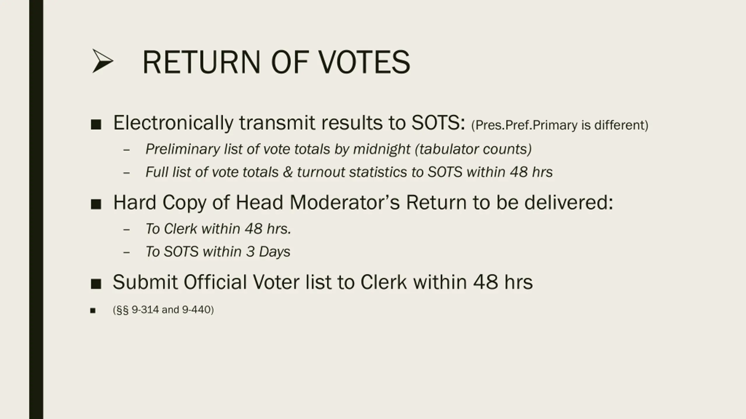 RETURN OF VOTES Electronically transmit results to SOTS: (Pres.Pref.Primary is different) Preliminary list of vote totals by midnight (tabulator counts) Full list of vote totals & turnout statistics to SOTS within 48 hrs Hard Copy of Head Moderator s Return to be delivered: To Clerk within 48 hrs. To SOTS within 3 Days Submit Official Voter list to Clerk within 48 hrs ( 9-314 and 9-440)