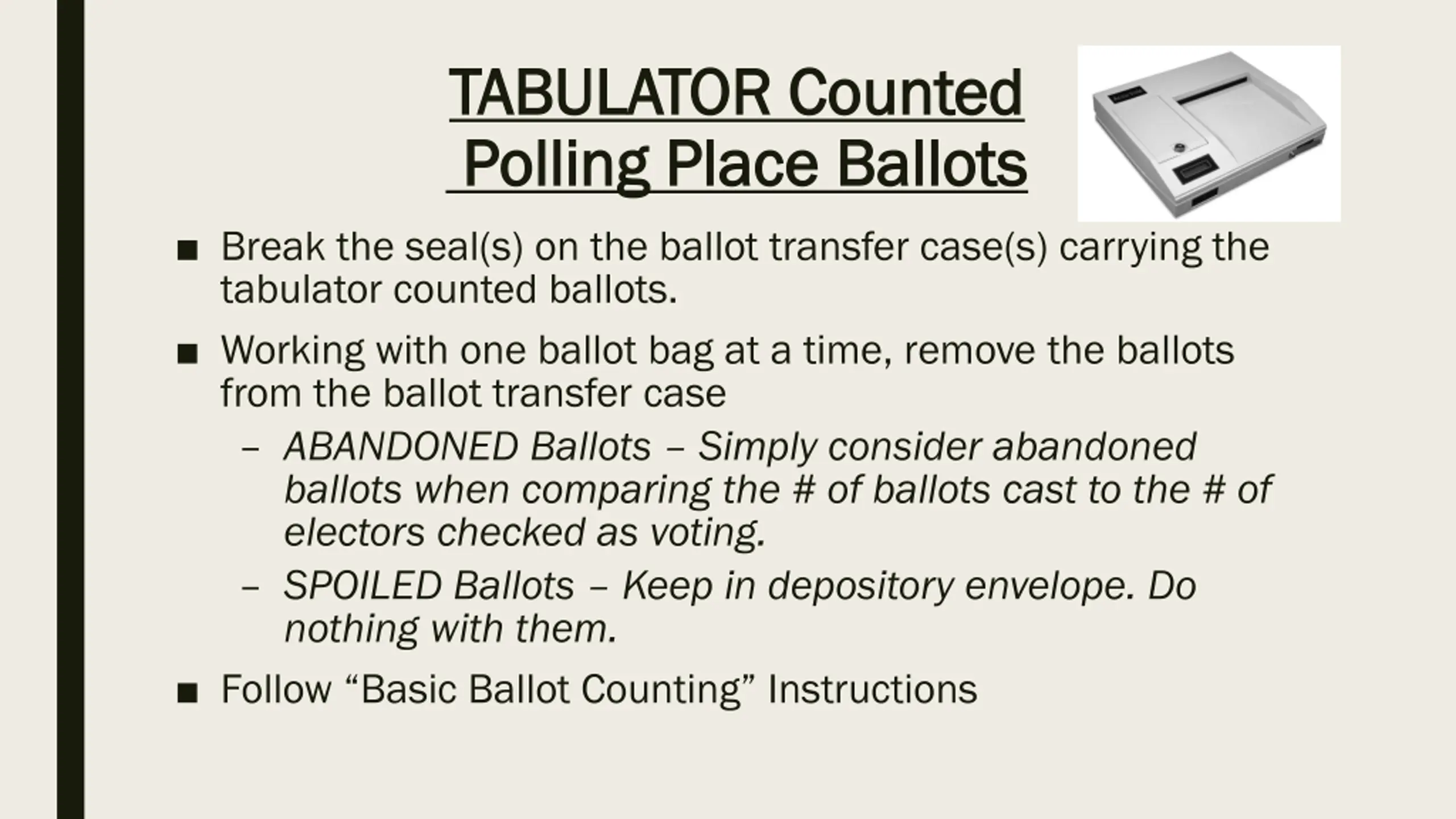 Stacks Image 225 TABULATOR Counted TABULATOR Counted Polling Place Ballots Polling Place Ballots Break the seal(s) on the ballot transfer case(s) carrying the tabulator counted ballots. Working with one ballot bag at a time, remove the ballots from the ballot transfer case ABANDONED Ballots Simply consider abandoned ballots when comparing the # of ballots cast to the # of electors checked as voting. SPOILED Ballots Keep in depository envelope. Do nothing with them. Follow Basic Ballot Counting Instructions