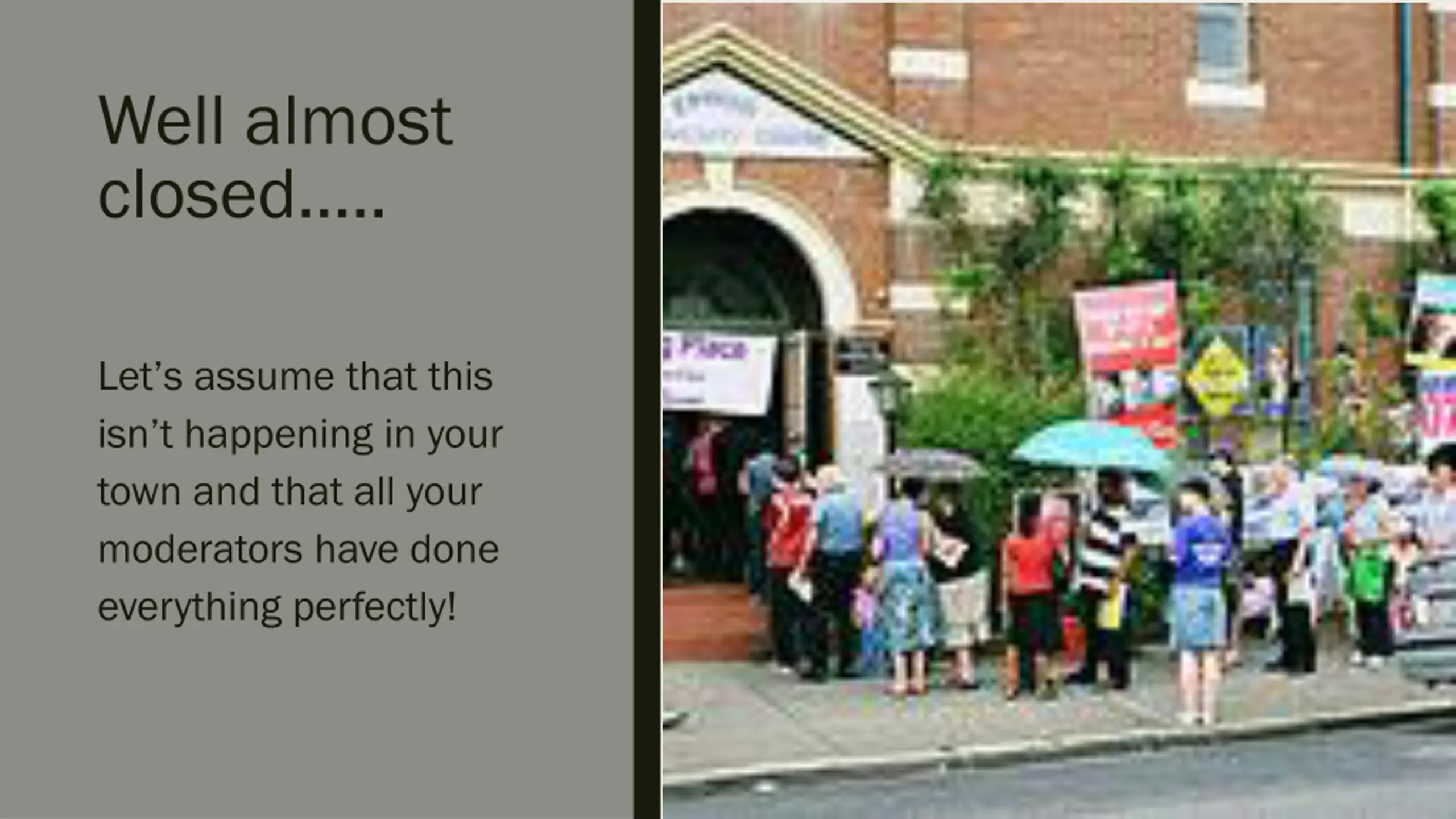 Well almost closed .. Let s assume that this isn t happening in your town and that all your moderators have done everything perfectly!