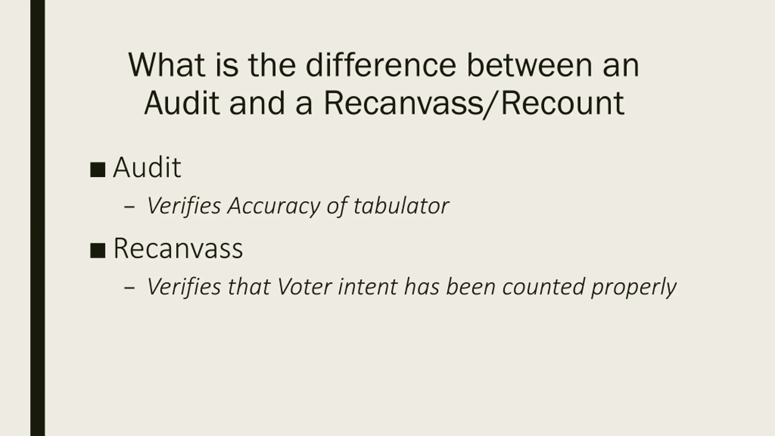 What is the difference between an Audit and a Recanvass/Recount Audit Verifies Accuracy of tabulator Recanvass Verifies that Voter intent has been counted properly