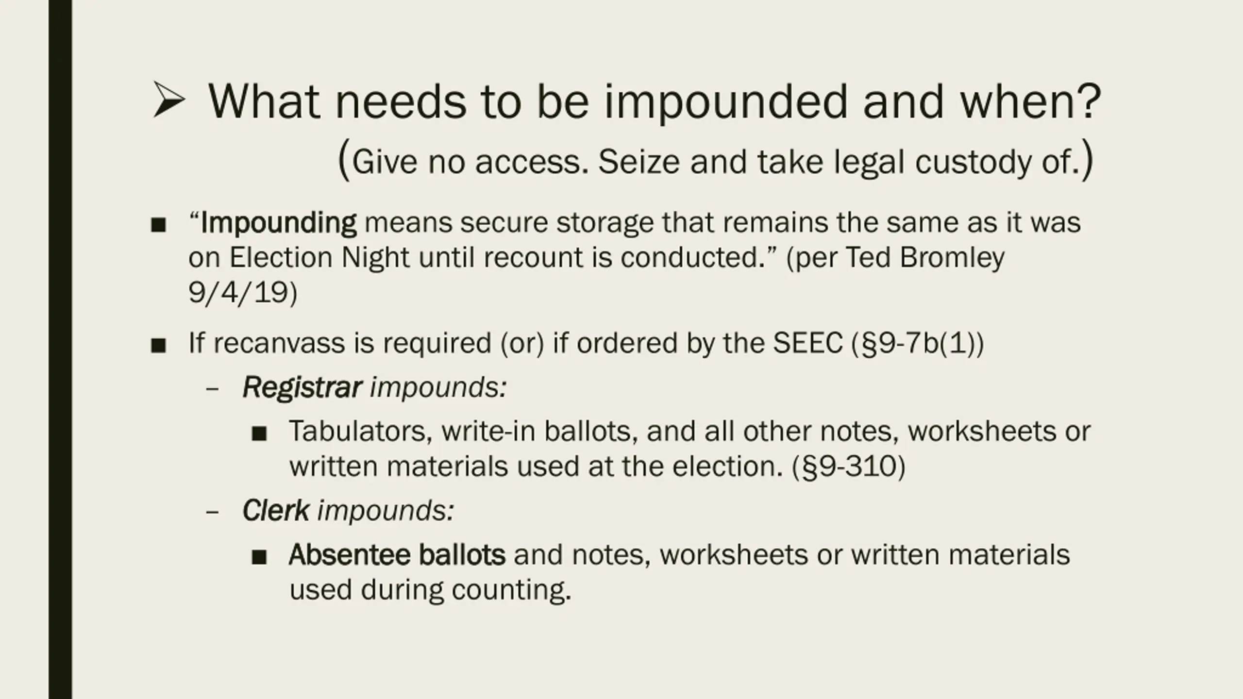 What needs to be impounded and when? (Give no access. Seize and take legal custody of.) Impounding Impounding means secure storage that remains the same as it was on Election Night until recount is conducted. (per Ted Bromley 9/4/19) If recanvass is required (or) if ordered by the SEEC ( 9-7b(1)) Registrar Registrar impounds: Tabulators, write-in ballots, and all other notes, worksheets or written materials used at the election. ( 9-310) Clerk Clerk impounds: Absentee ballots Absentee ballots and notes, worksheets or written materials used during counting.