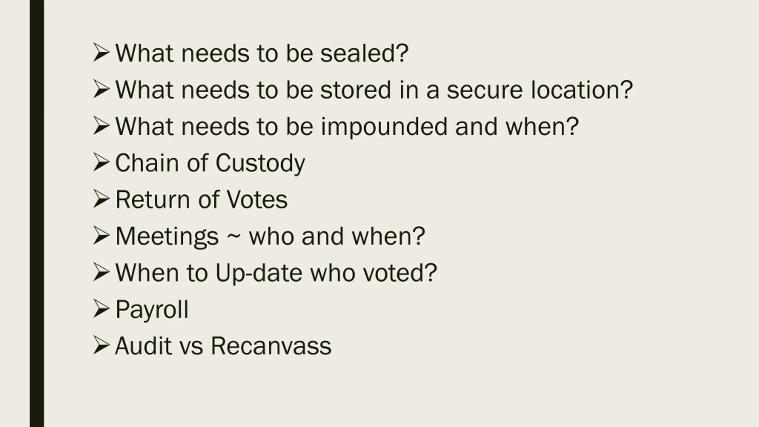 What needs to be sealed? What needs to be stored in a secure location? What needs to be impounded and when? Chain of Custody Return of Votes Meetings ~ who and when? When to Up-date who voted? Payroll Audit vs Recanvass