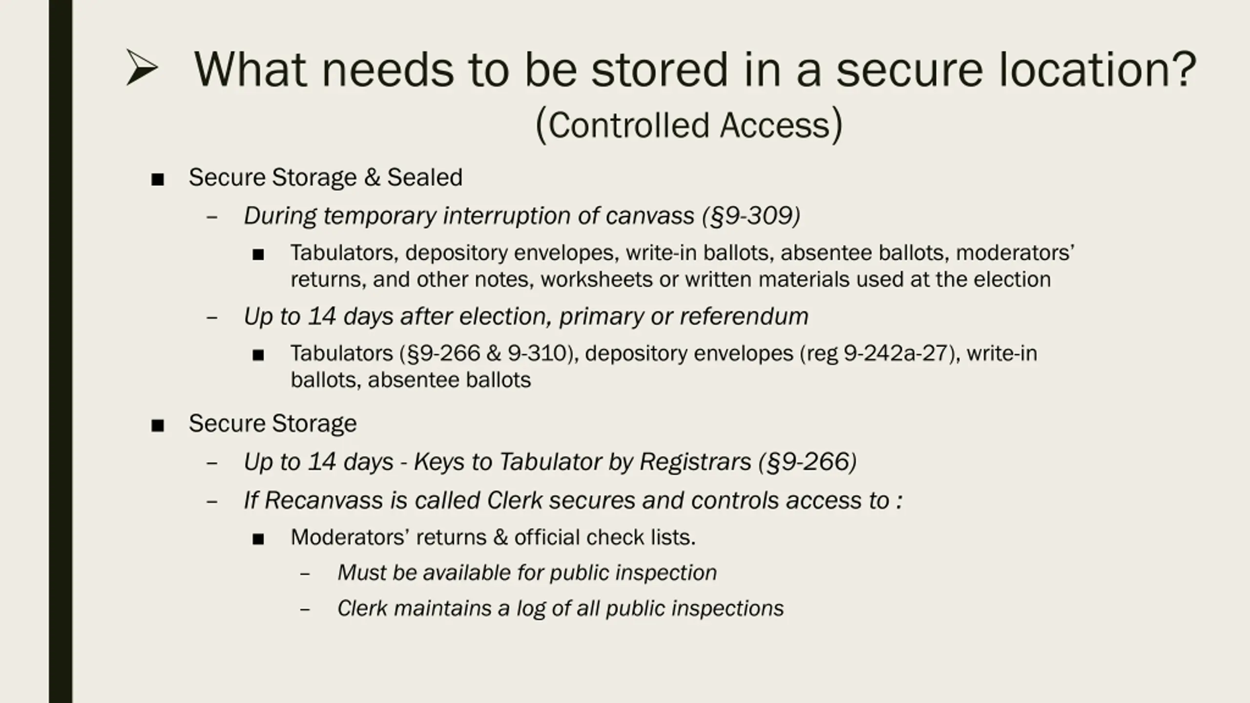 What needs to be stored in a secure location? (Controlled Access) Secure Storage & Sealed During temporary interruption of canvass ( 9-309) Tabulators, depository envelopes, write-in ballots, absentee ballots, moderators returns, and other notes, worksheets or written materials used at the election Up to 14 days after election, primary or referendum Tabulators ( 9-266 & 9-310), depository envelopes (reg 9-242a-27), write-in ballots, absentee ballots Secure Storage Up to 14 days - Keys to Tabulator by Registrars ( 9-266) If Recanvass is called Clerk secures and controls access to : Moderators returns & official check lists. Must be available for public inspection Clerk maintains a log of all public inspections