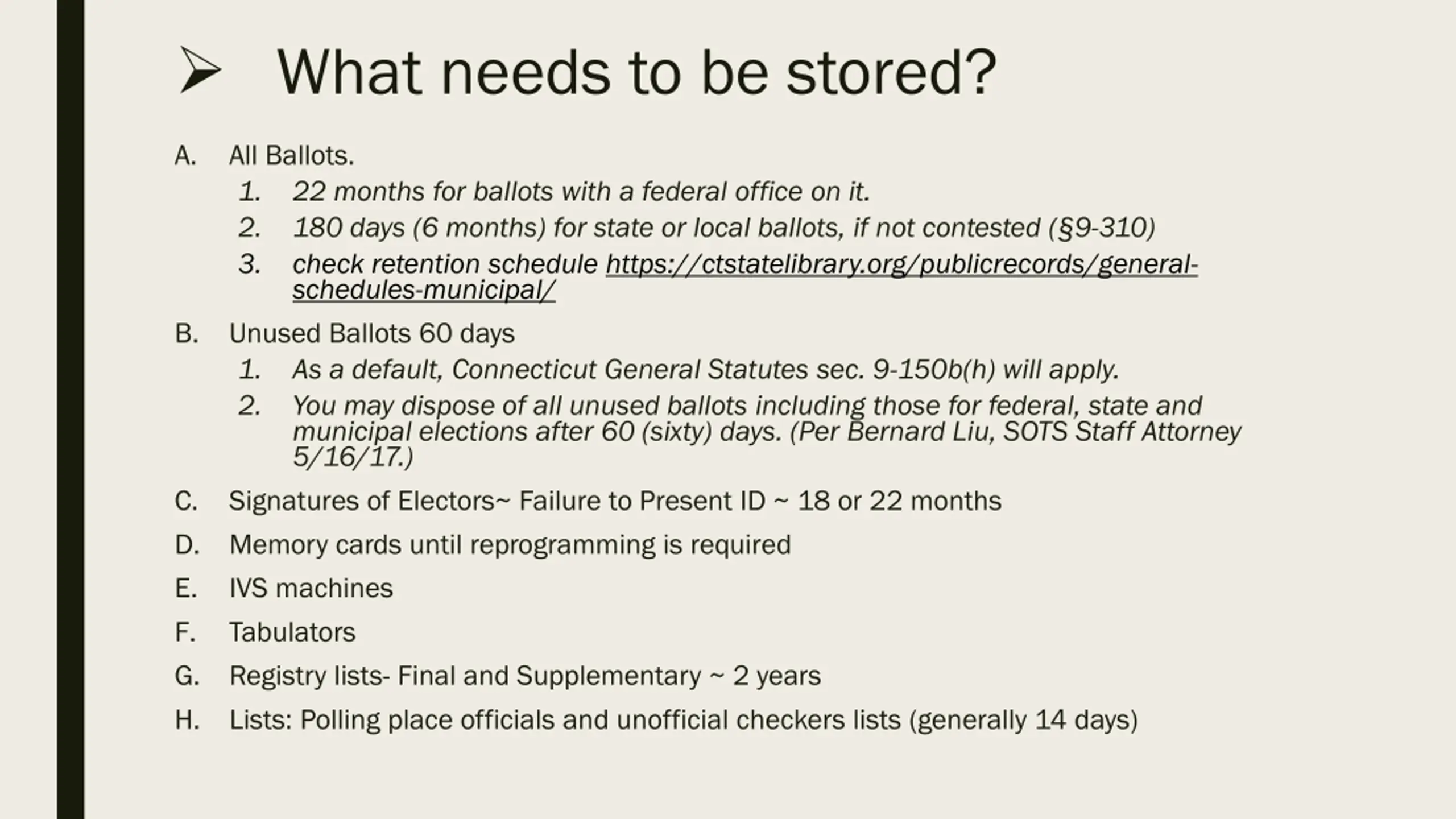 What needs to be stored? A. All Ballots. 1. 22 months for ballots with a federal office on it. 2. 180 days (6 months) for state or local ballots, if not contested ( 9-310) 3. check retention schedule https://ctstatelibrary.org/publicrecords/general- schedules-municipal/ Unused Ballots 60 days 1. As a default, Connecticut General Statutes sec. 9-150b(h) will apply. 2. You may dispose of all unused ballots including those for federal, state and municipal elections after 60 (sixty) days. (Per Bernard Liu, SOTS Staff Attorney 5/16/17.) Signatures of Electors~ Failure to Present ID ~ 18 or 22 months Memory cards until reprogramming is required IVS machines Tabulators Registry lists- Final and Supplementary ~ 2 years Lists: Polling place officials and unofficial checkers lists (generally 14 days) B. C. D. E. F. G. H.