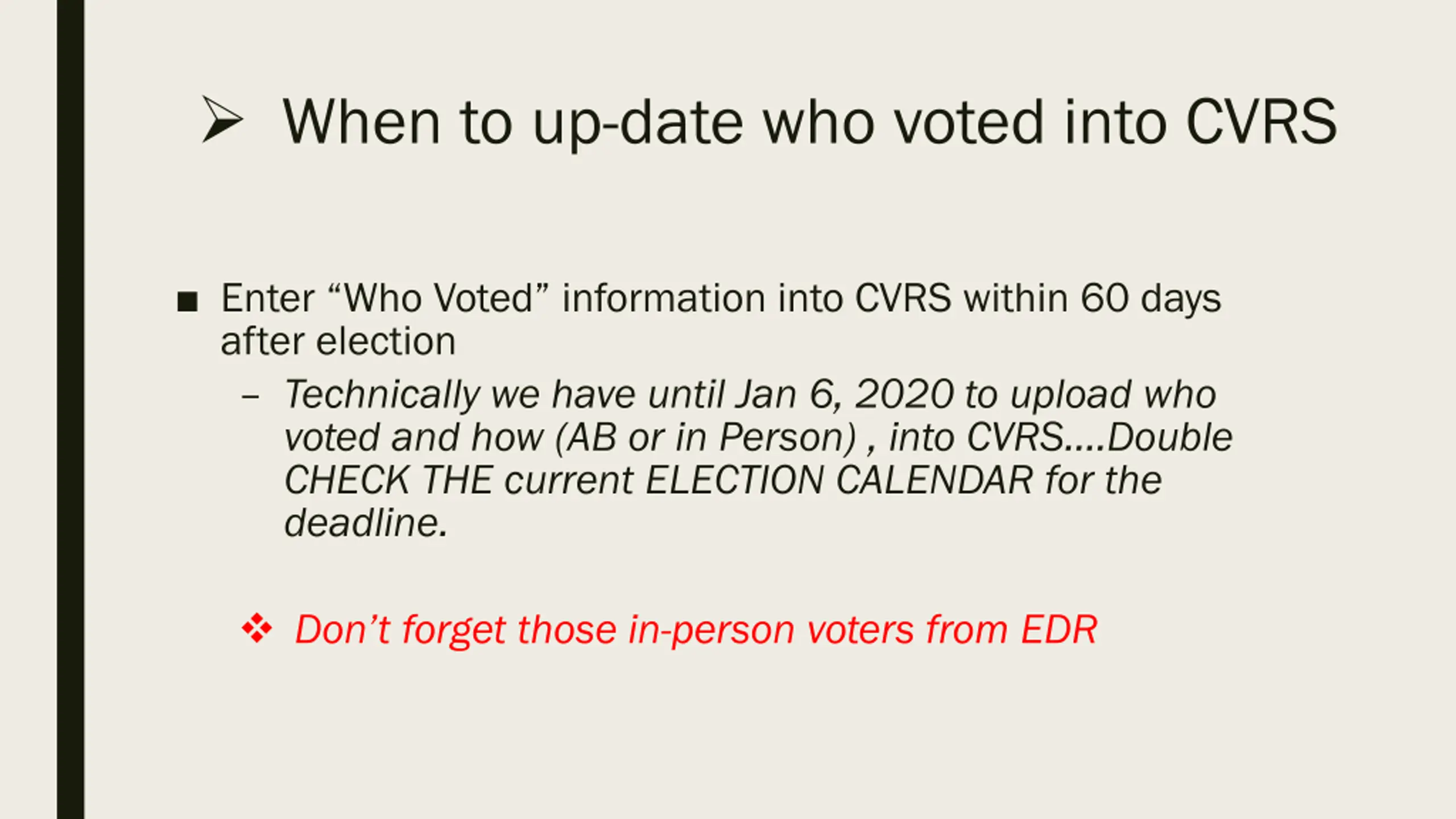 When to up-date who voted into CVRS Enter Who Voted information into CVRS within 60 days after election Technically we have until Jan 6, 2020 to upload who voted and how (AB or in Person) , into CVRS .Double CHECK THE current ELECTION CALENDAR for the deadline. Don t forget those in-person voters from EDR