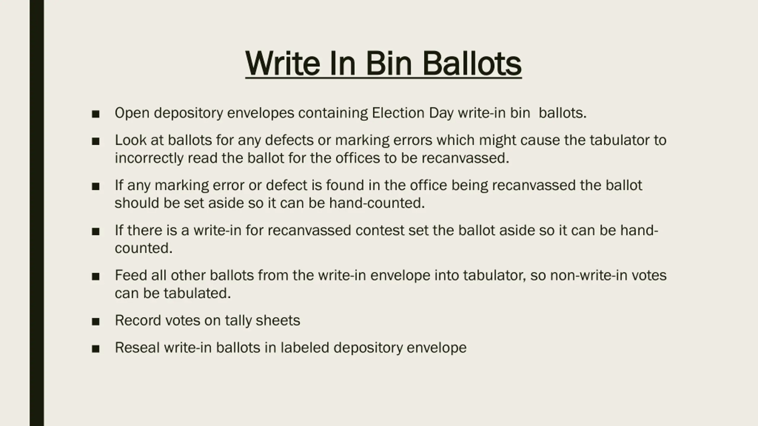 Write In Bin Ballots Write In Bin Ballots Open depository envelopes containing Election Day write-in bin ballots. Look at ballots for any defects or marking errors which might cause the tabulator to incorrectly read the ballot for the offices to be recanvassed. If any marking error or defect is found in the office being recanvassed the ballot should be set aside so it can be hand-counted. If there is a write-in for recanvassed contest set the ballot aside so it can be hand- counted. Feed all other ballots from the write-in envelope into tabulator, so non-write-in votes can be tabulated. Record votes on tally sheets Reseal write-in ballots in labeled depository envelope