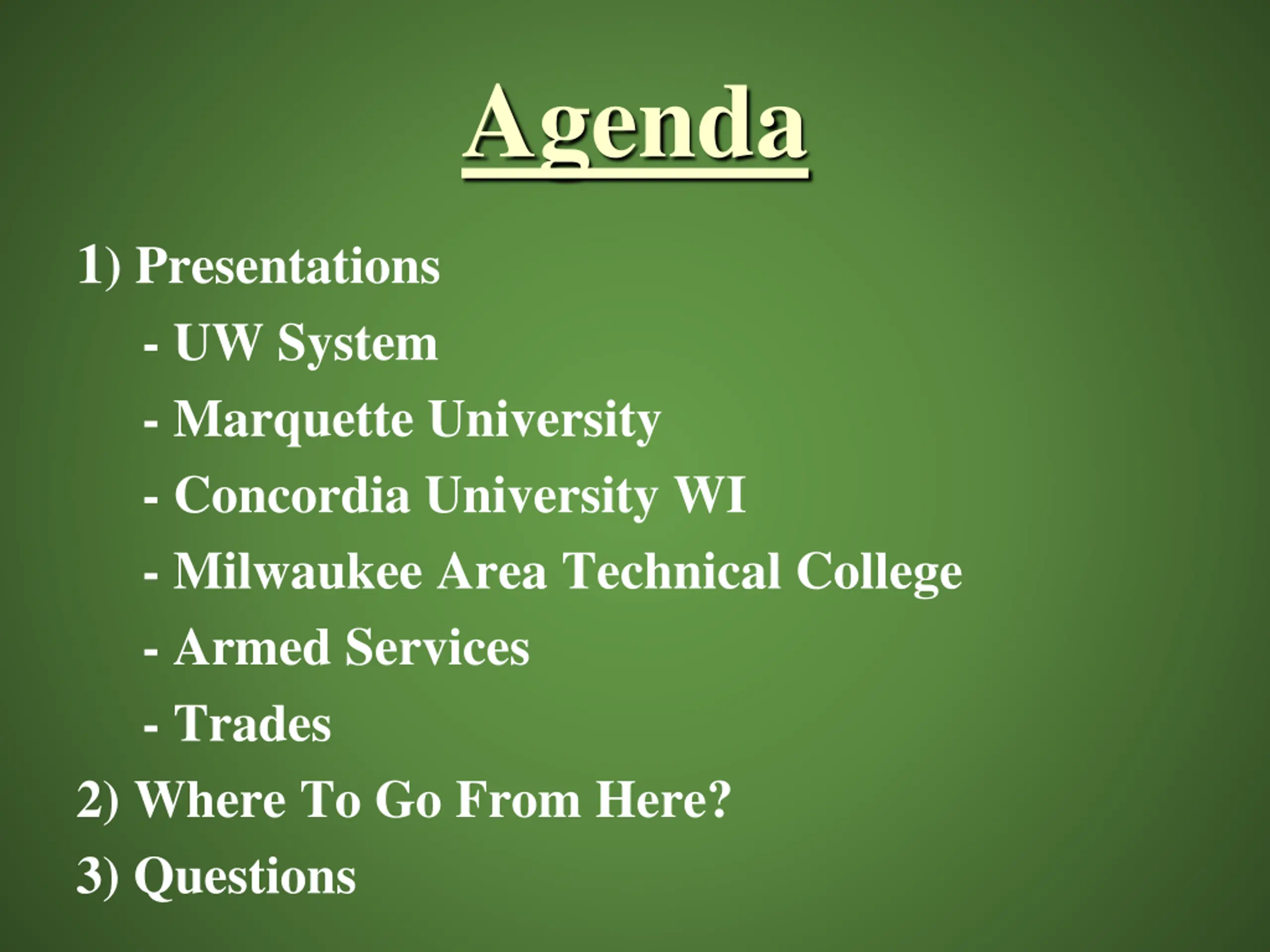 Agenda 1) Presentations - UW System - Marquette University - Concordia University WI - Milwaukee Area Technical College - Armed Services - Trades 2) Where To Go From Here? 3) Questions