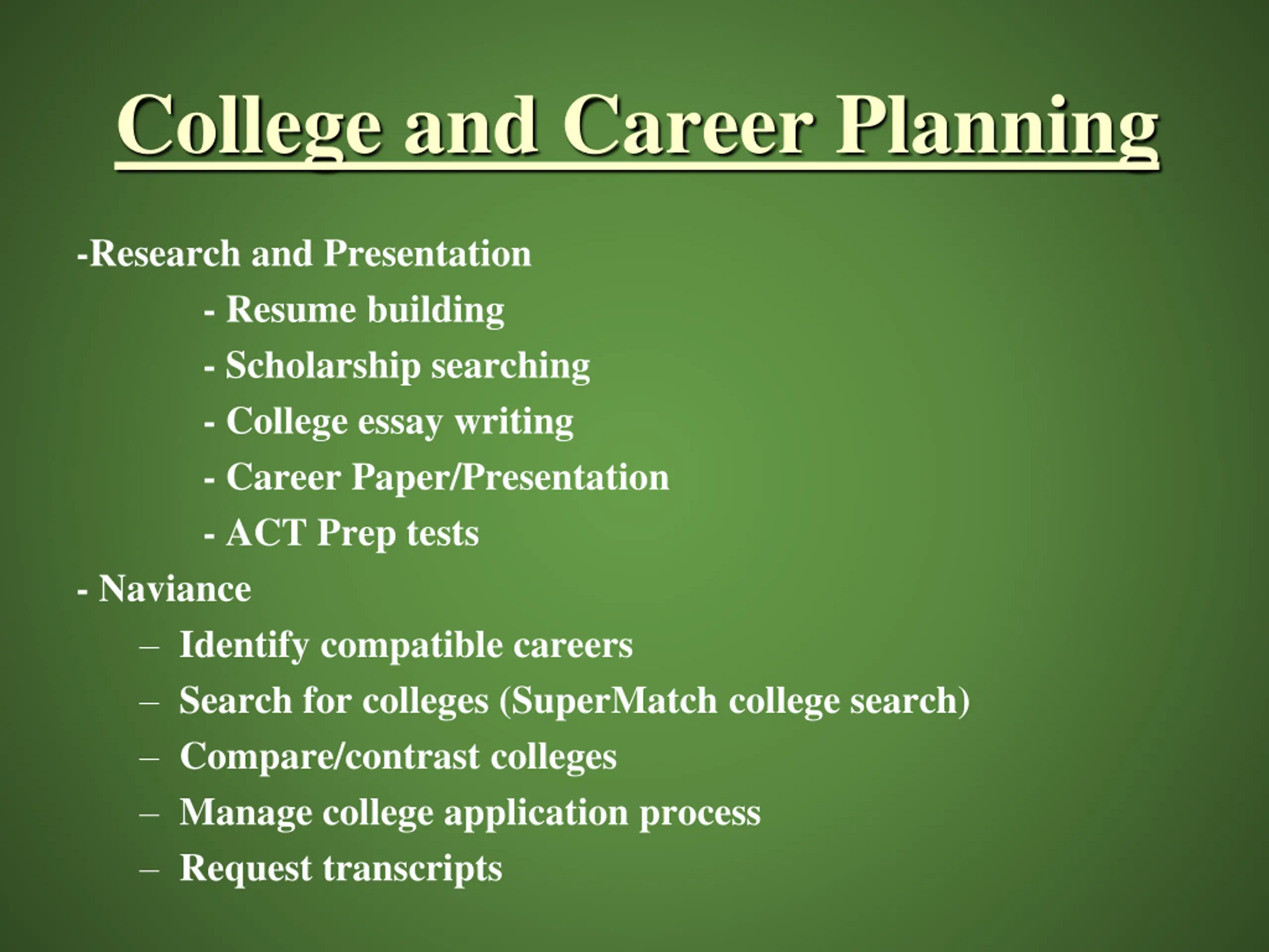 College and Career Planning -Research and Presentation - Resume building - Scholarship searching - College essay writing - Career Paper/Presentation - ACT Prep tests - Naviance Identify compatible careers Search for colleges (SuperMatch college search) Compare/contrast colleges Manage college application process Request transcripts