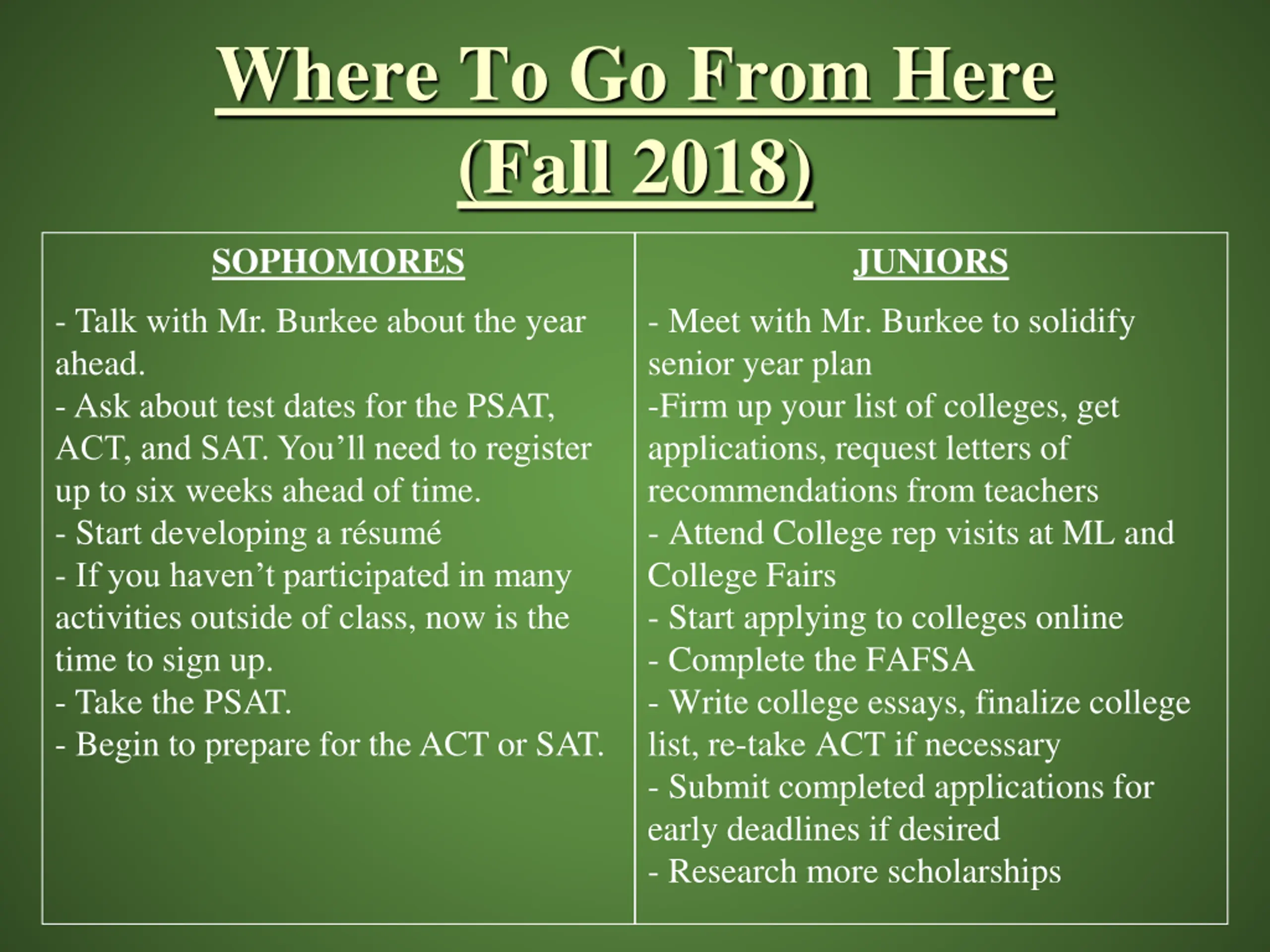 Where To Go From Here (Fall 2018) SOPHOMORES JUNIORS - Talk with Mr. Burkee about the year ahead. - Ask about test dates for the PSAT, ACT, and SAT. You ll need to register up to six weeks ahead of time. - Start developing a r sum - If you haven t participated in many activities outside of class, now is the time to sign up. - Take the PSAT. - Begin to prepare for the ACT or SAT. - Meet with Mr. Burkee to solidify senior year plan -Firm up your list of colleges, get applications, request letters of recommendations from teachers - Attend College rep visits at ML and College Fairs - Start applying to colleges online - Complete the FAFSA - Write college essays, finalize college list, re-take ACT if necessary - Submit completed applications for early deadlines if desired - Research more scholarships