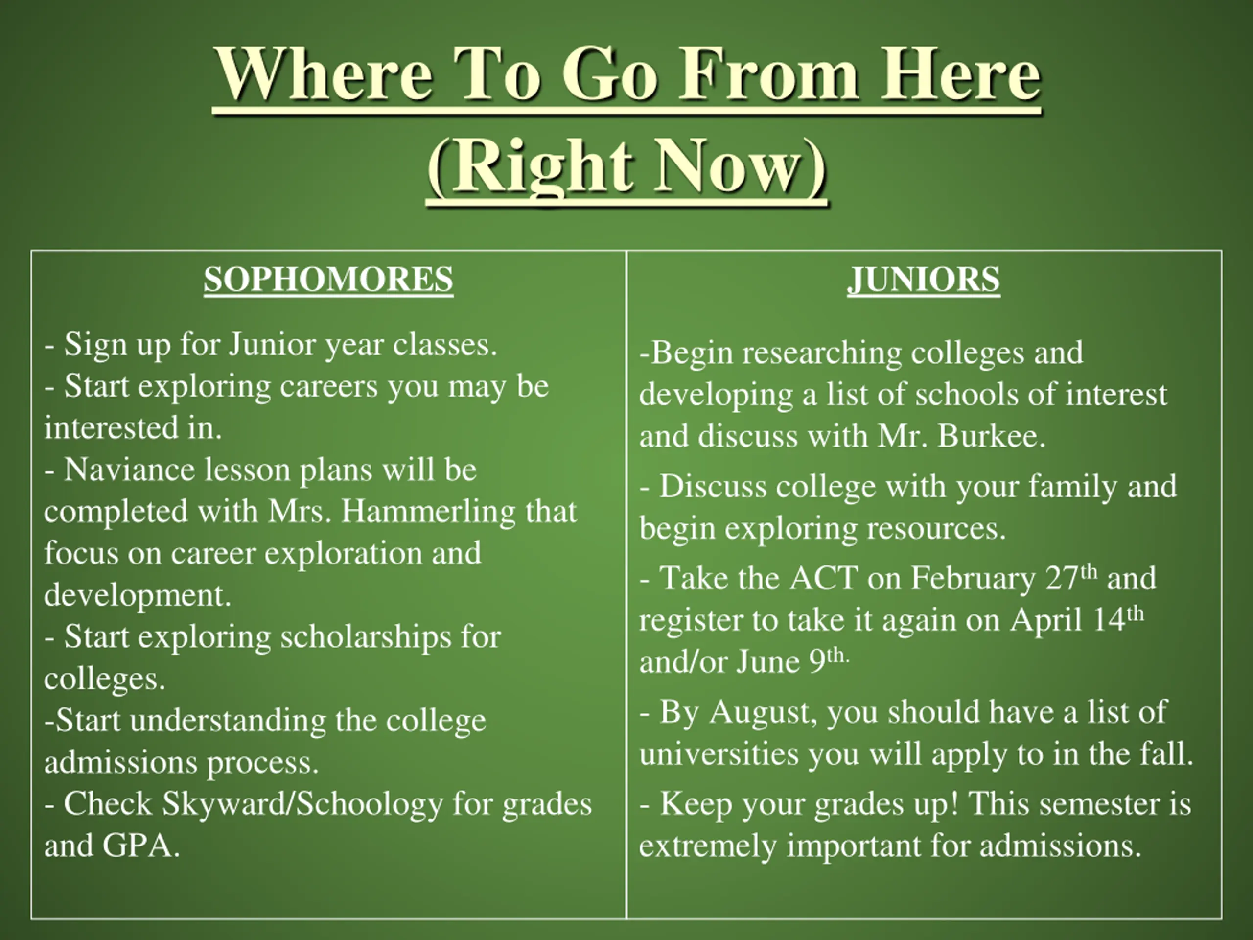 Where To Go From Here (Right Now) SOPHOMORES JUNIORS - Sign up for Junior year classes. - Start exploring careers you may be interested in. - Naviance lesson plans will be completed with Mrs. Hammerling that focus on career exploration and development. - Start exploring scholarships for colleges. -Start understanding the college admissions process. - Check Skyward/Schoology for grades and GPA. -Begin researching colleges and developing a list of schools of interest and discuss with Mr. Burkee. - Discuss college with your family and begin exploring resources. - Take the ACT on February 27th and register to take it again on April 14th and/or June 9th. - By August, you should have a list of universities you will apply to in the fall. - Keep your grades up! This semester is extremely important for admissions.