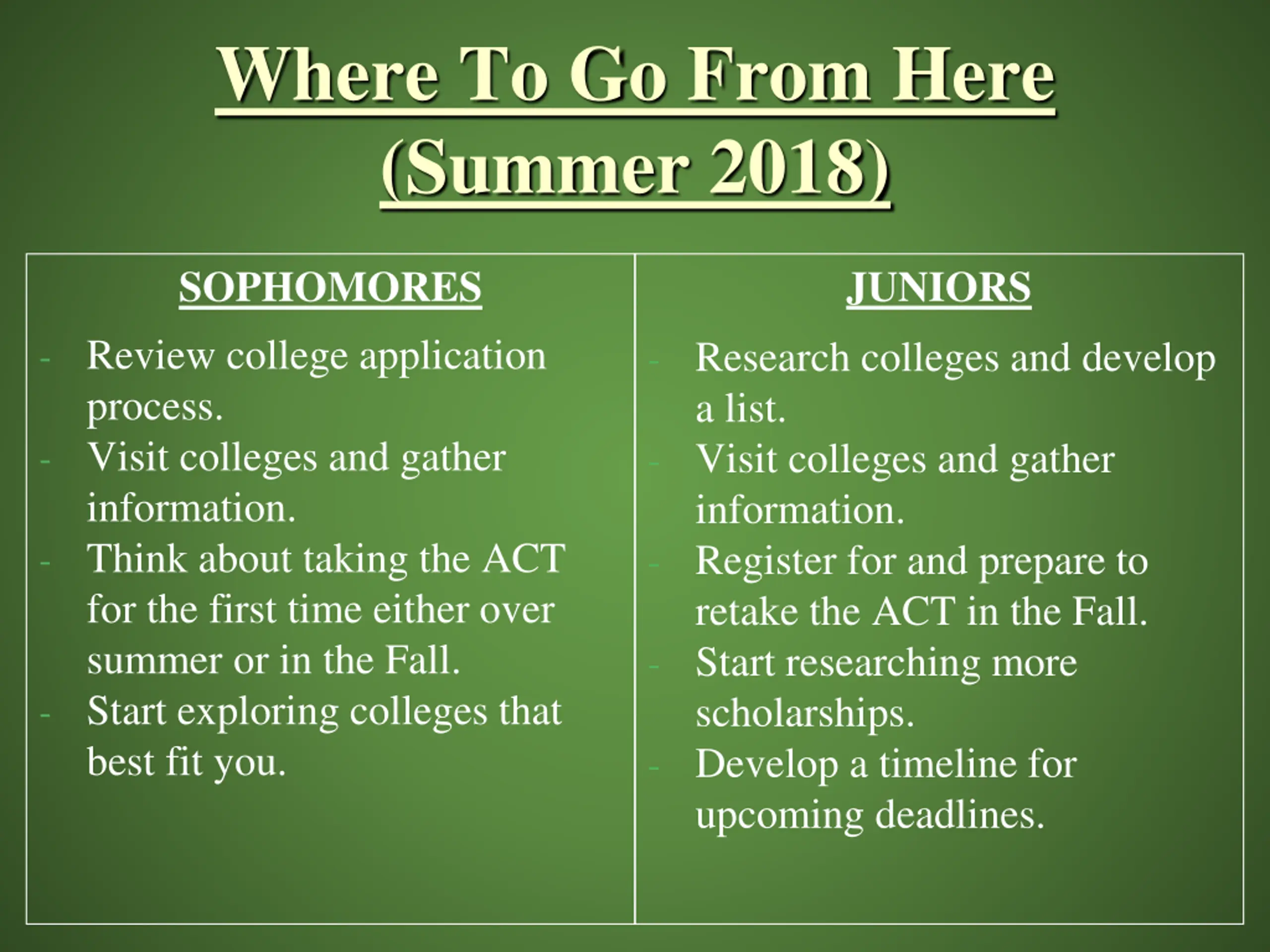 Where To Go From Here (Summer 2018) SOPHOMORES JUNIORS - Review college application process. - Visit colleges and gather information. - Think about taking the ACT for the first time either over summer or in the Fall. - Start exploring colleges that best fit you. - Research colleges and develop a list. - Visit colleges and gather information. - Register for and prepare to retake the ACT in the Fall. - Start researching more scholarships. - Develop a timeline for upcoming deadlines.