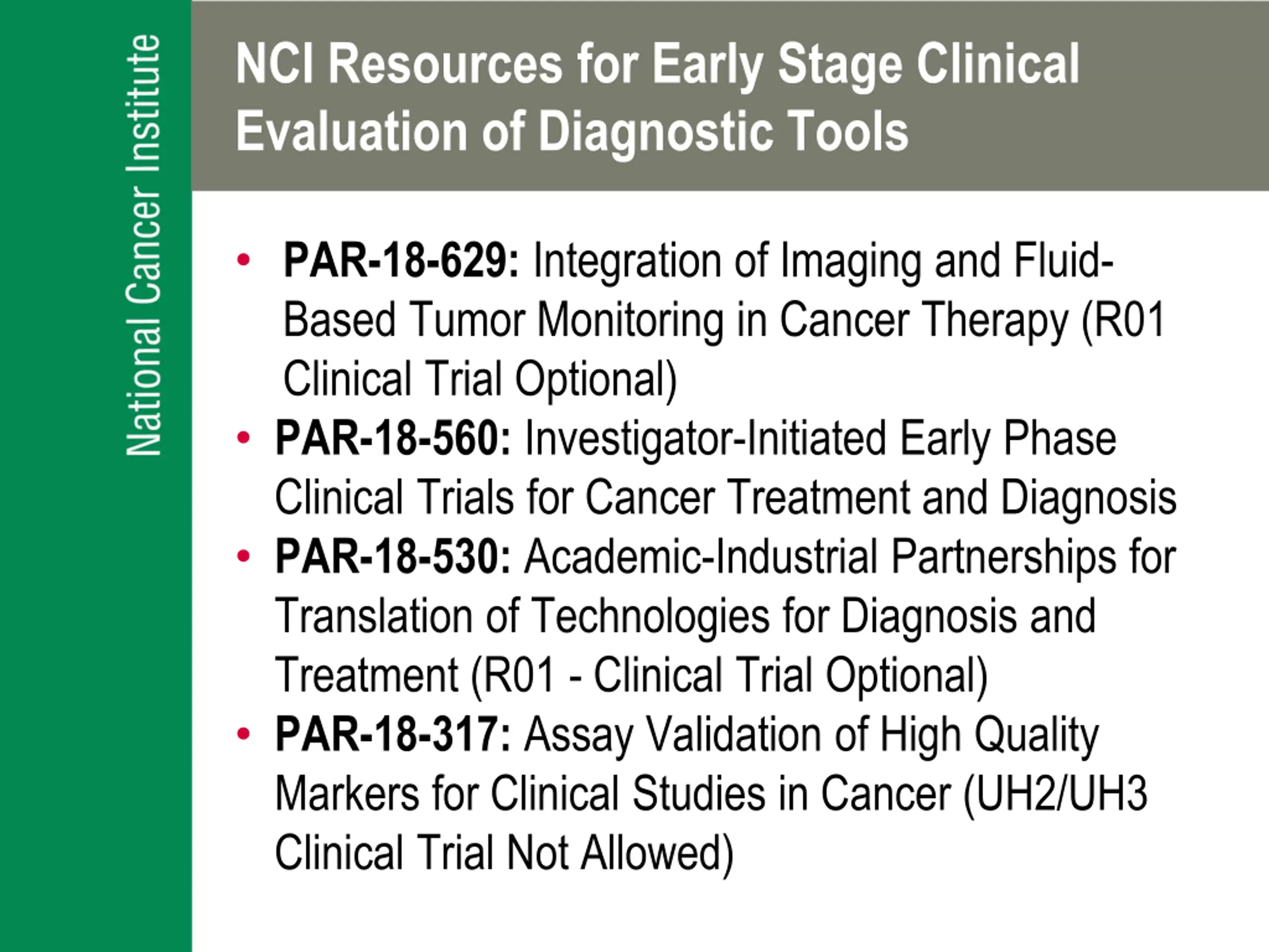 NCI Resources for Early Stage Clinical Evaluation of Diagnostic Tools PAR-18-629: Integration of Imaging and Fluid- Based Tumor Monitoring in Cancer Therapy (R01 Clinical Trial Optional) PAR-18-560: Investigator-Initiated Early Phase Clinical Trials for Cancer Treatment and Diagnosis PAR-18-530: Academic-Industrial Partnerships for Translation of Technologies for Diagnosis and Treatment (R01 - Clinical Trial Optional) PAR-18-317: Assay Validation of High Quality Markers for Clinical Studies in Cancer (UH2/UH3 Clinical Trial Not Allowed)