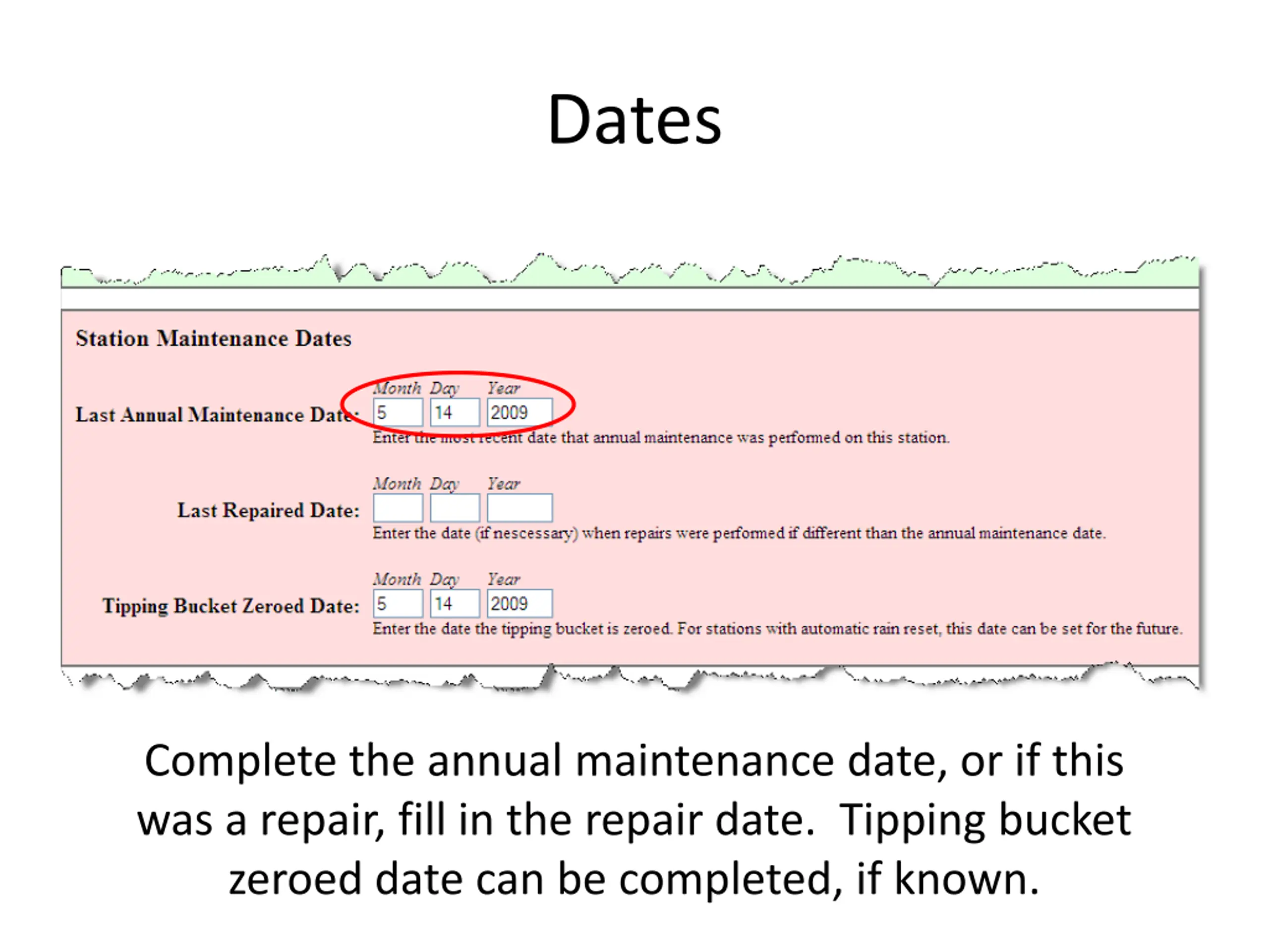 Dates Complete the annual maintenance date, or if this was a repair, fill in the repair date. Tipping bucket zeroed date can be completed, if known.
