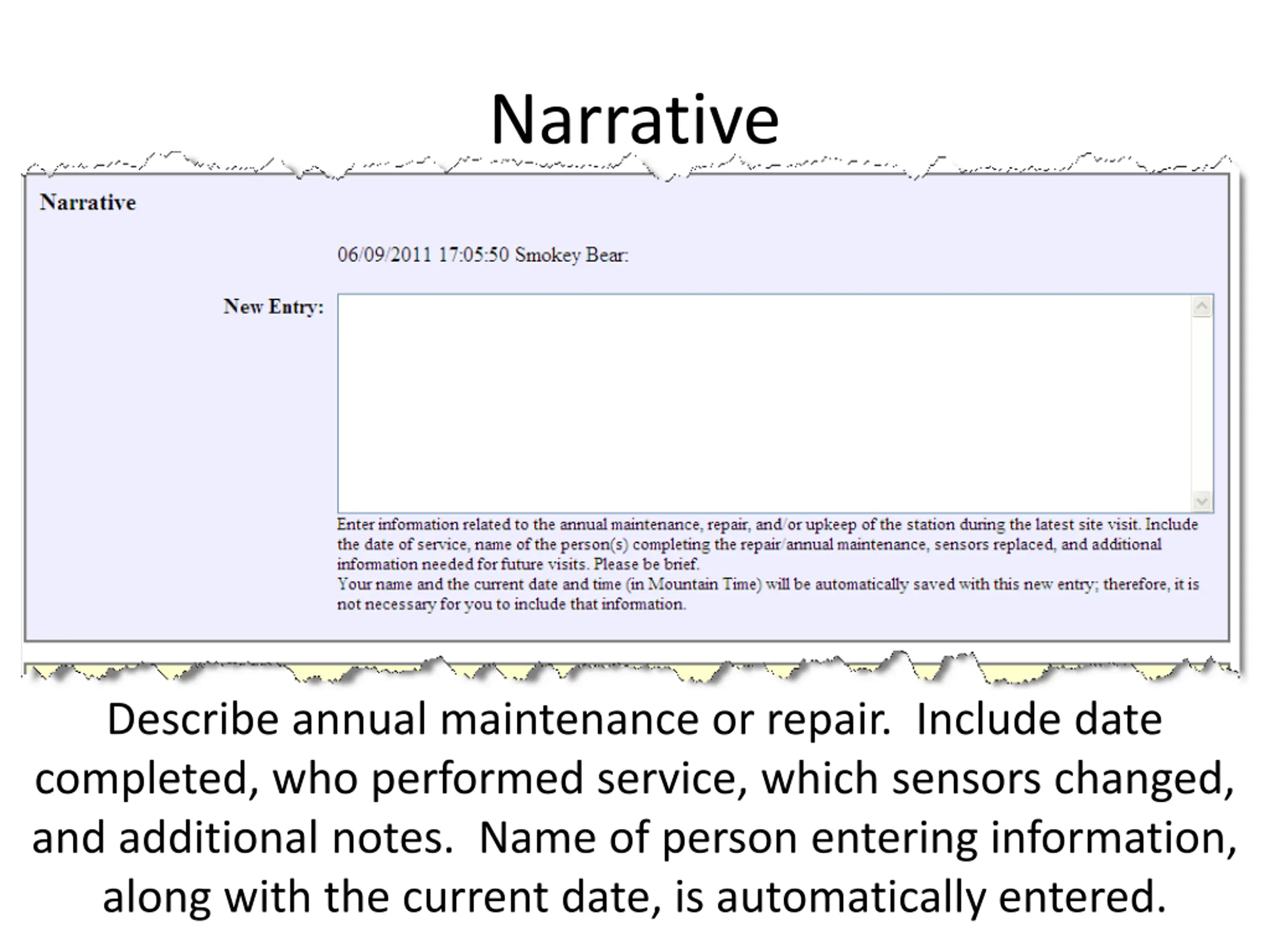 Narrative Describe annual maintenance or repair. Include date completed, who performed service, which sensors changed, and additional notes. Name of person entering information, along with the current date, is automatically entered.