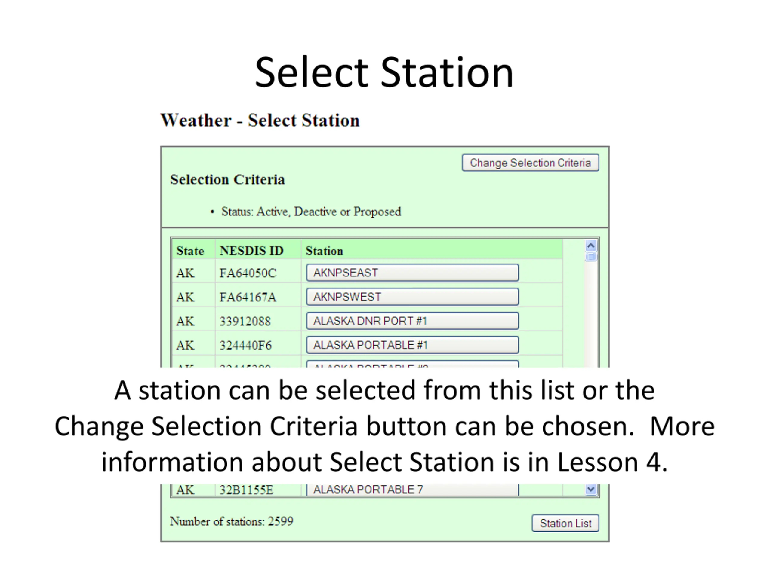 Select Station A station can be selected from this list or the Change Selection Criteria button can be chosen. More information about Select Station is in Lesson 4.