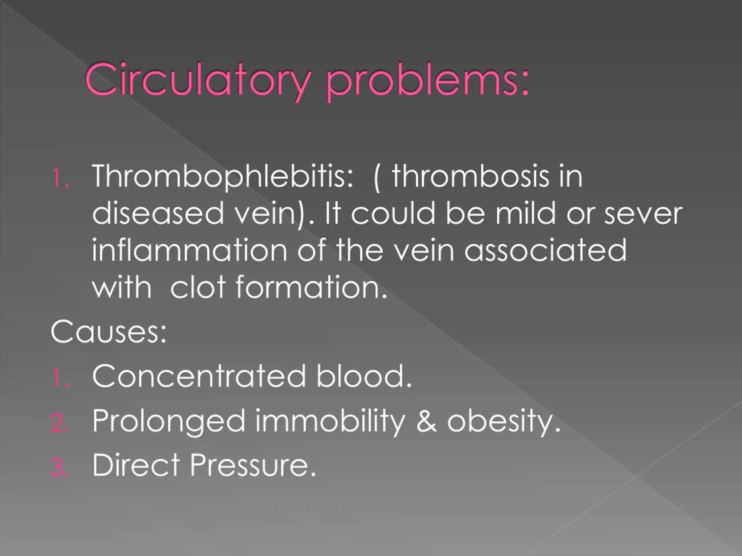 Circulatory problems: 1. Thrombophlebitis: ( thrombosis in diseased vein). It could be mild or sever inflammation of the vein associated with clot formation. Causes: 1. Concentrated blood. 2. Prolonged immobility & obesity. 3. Direct Pressure.