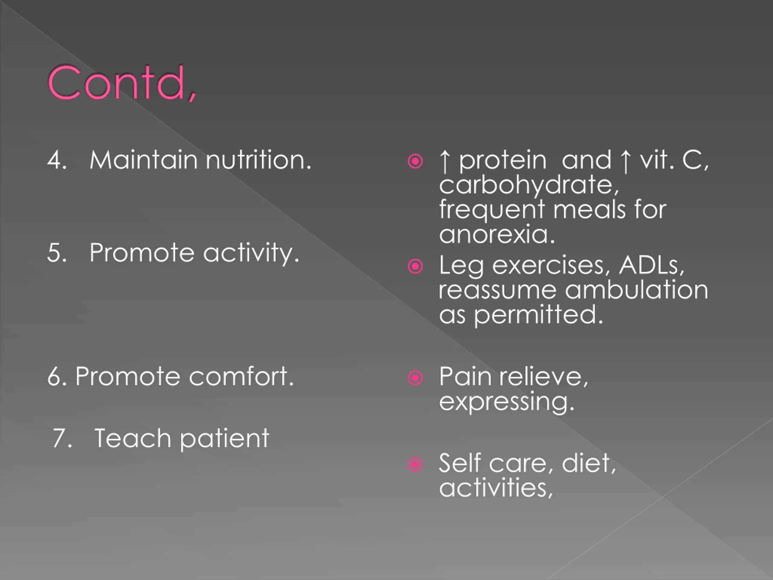 Contd, 4. Maintain nutrition. protein and vit. C, carbohydrate, frequent meals for anorexia. Leg exercises, ADLs, reassume ambulation as permitted. 5. Promote activity. 6. Promote comfort. Pain relieve, expressing. 7. Teach patient Self care, diet, activities,