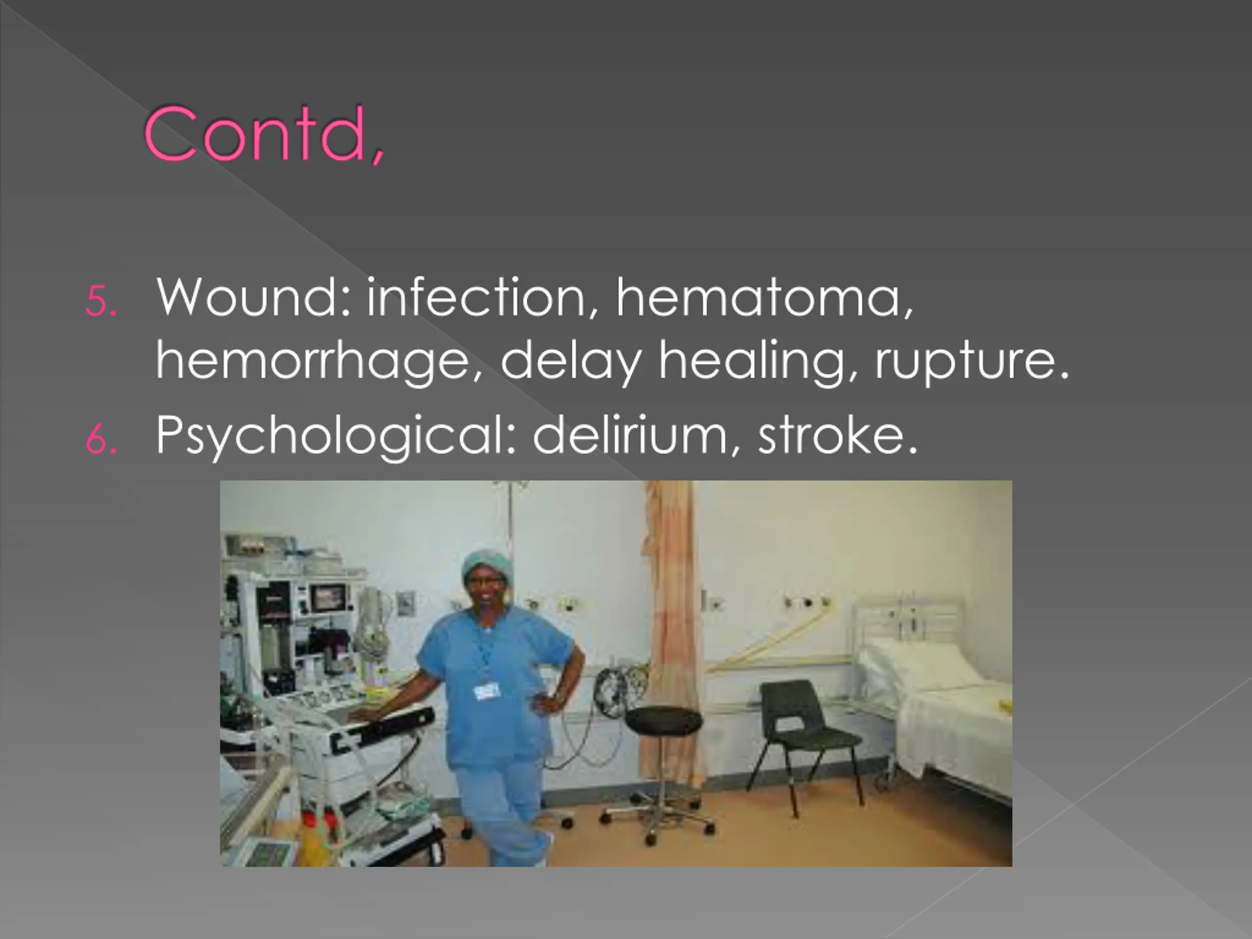 Contd, 5. Wound: infection, hematoma, hemorrhage, delay healing, rupture. 6. Psychological: delirium, stroke.