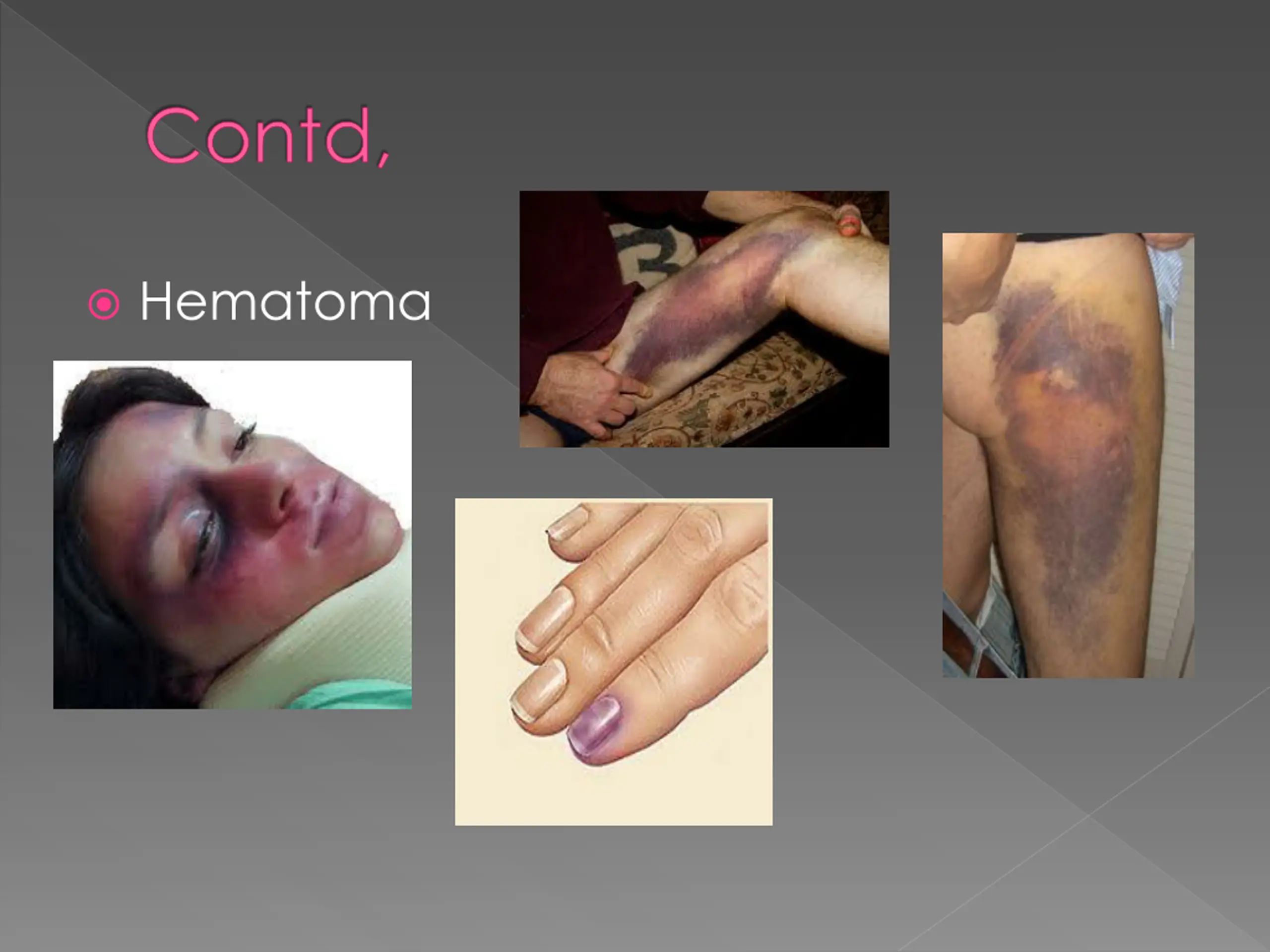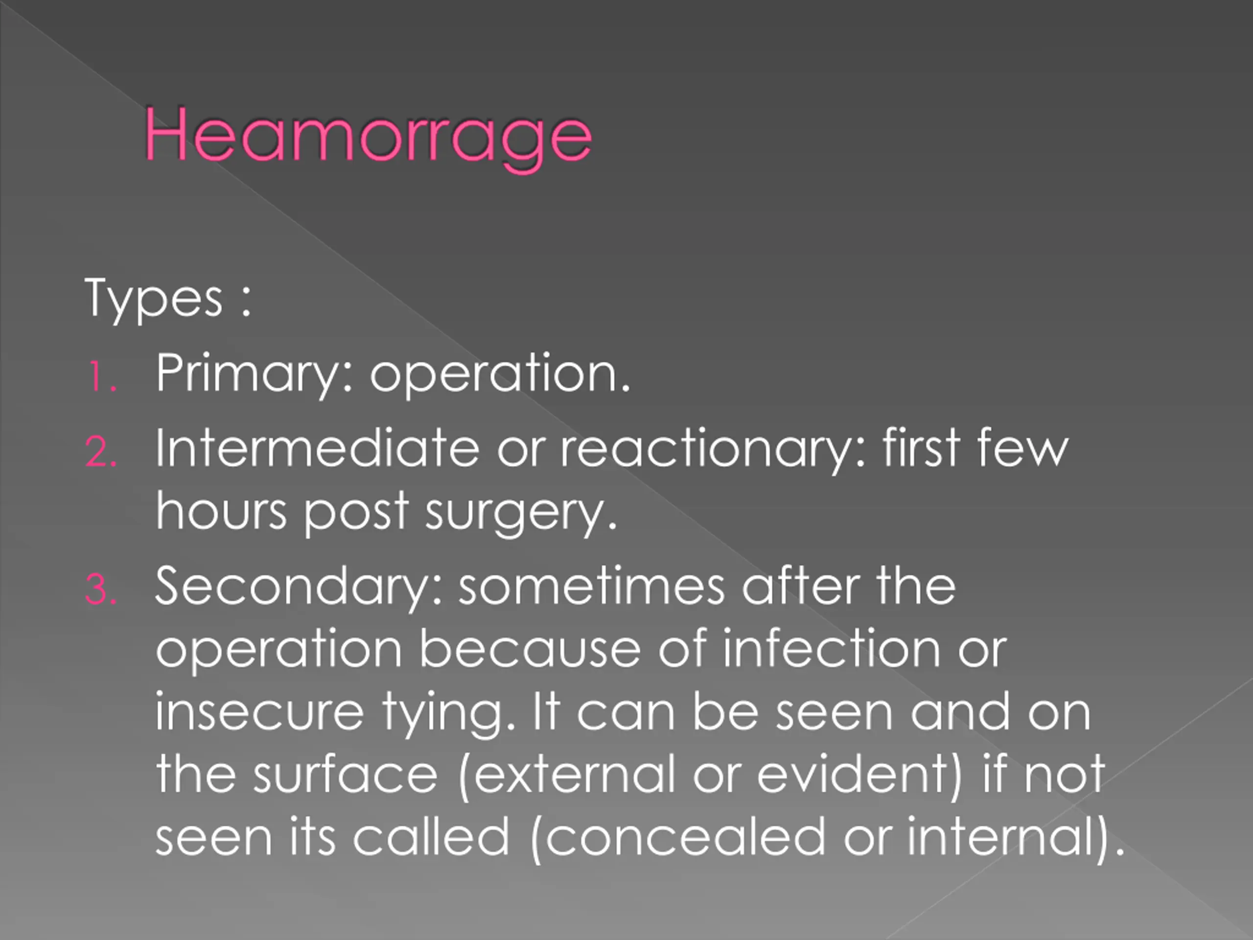 Heamorrage Types : 1. Primary: operation. 2. Intermediate or reactionary: first few hours post surgery. 3. Secondary: sometimes after the operation because of infection or insecure tying. It can be seen and on the surface (external or evident) if not seen its called (concealed or internal).