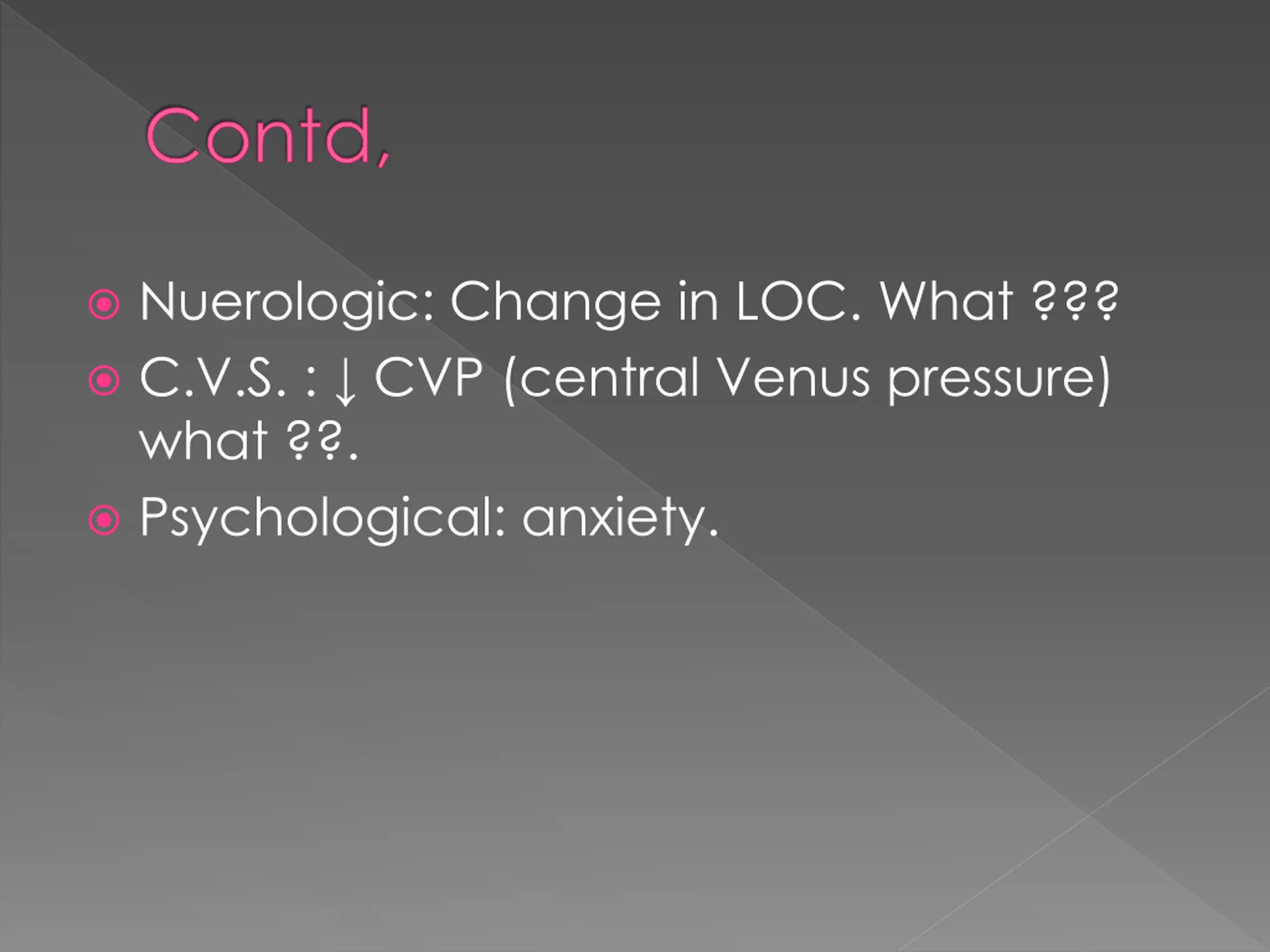 Contd, Nuerologic: Change in LOC. What ??? C.V.S. : CVP (central Venus pressure) what ??. Psychological: anxiety.