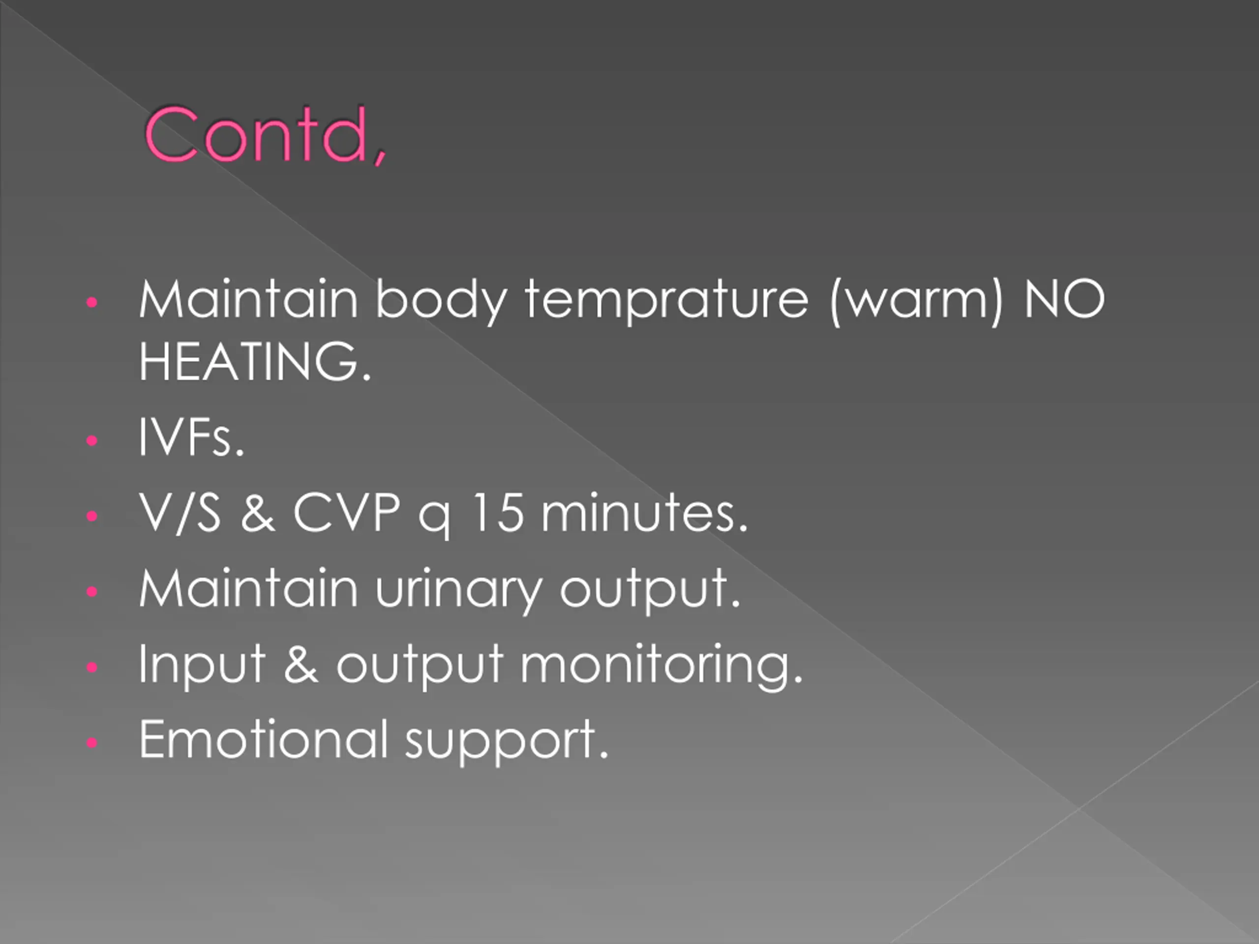 Contd, Maintain body temprature (warm) NO HEATING. IVFs. V/S & CVP q 15 minutes. Maintain urinary output. Input & output monitoring. Emotional support.