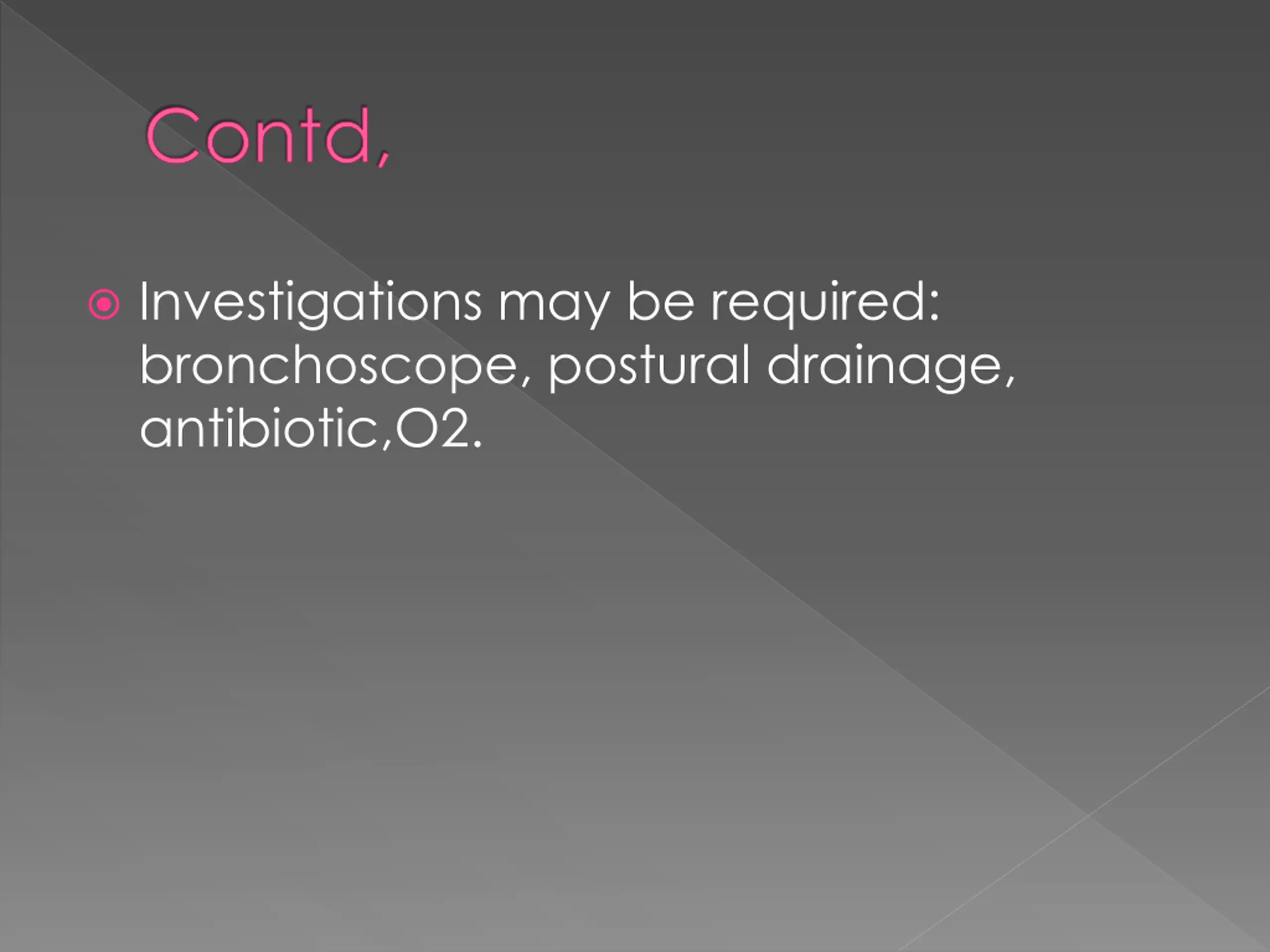 Contd, Investigations may be required: bronchoscope, postural drainage, antibiotic,O2.