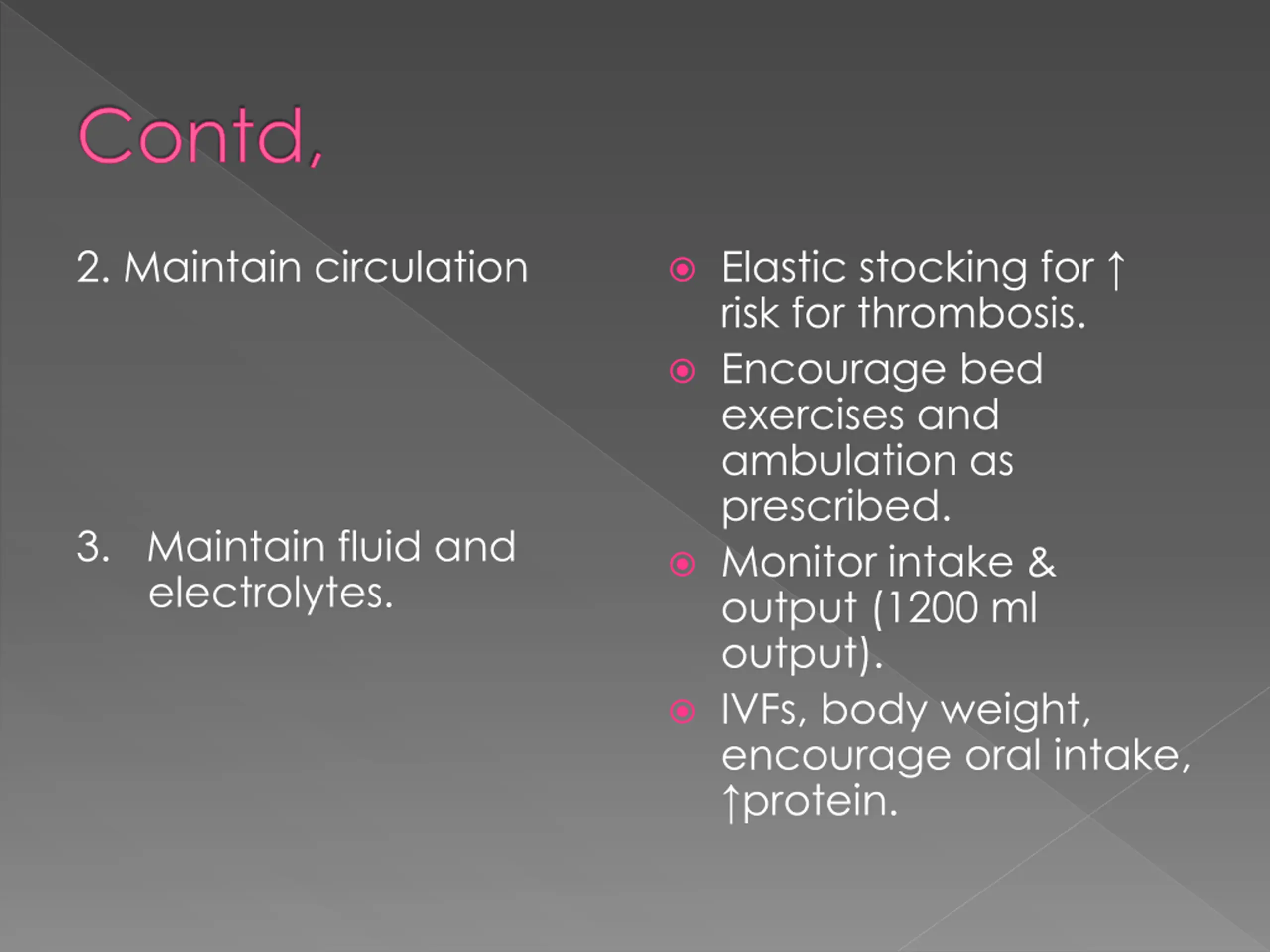 Contd, 2. Maintain circulation Elastic stocking for risk for thrombosis. Encourage bed exercises and ambulation as prescribed. Monitor intake & output (1200 ml output). IVFs, body weight, encourage oral intake, protein. 3. Maintain fluid and electrolytes.