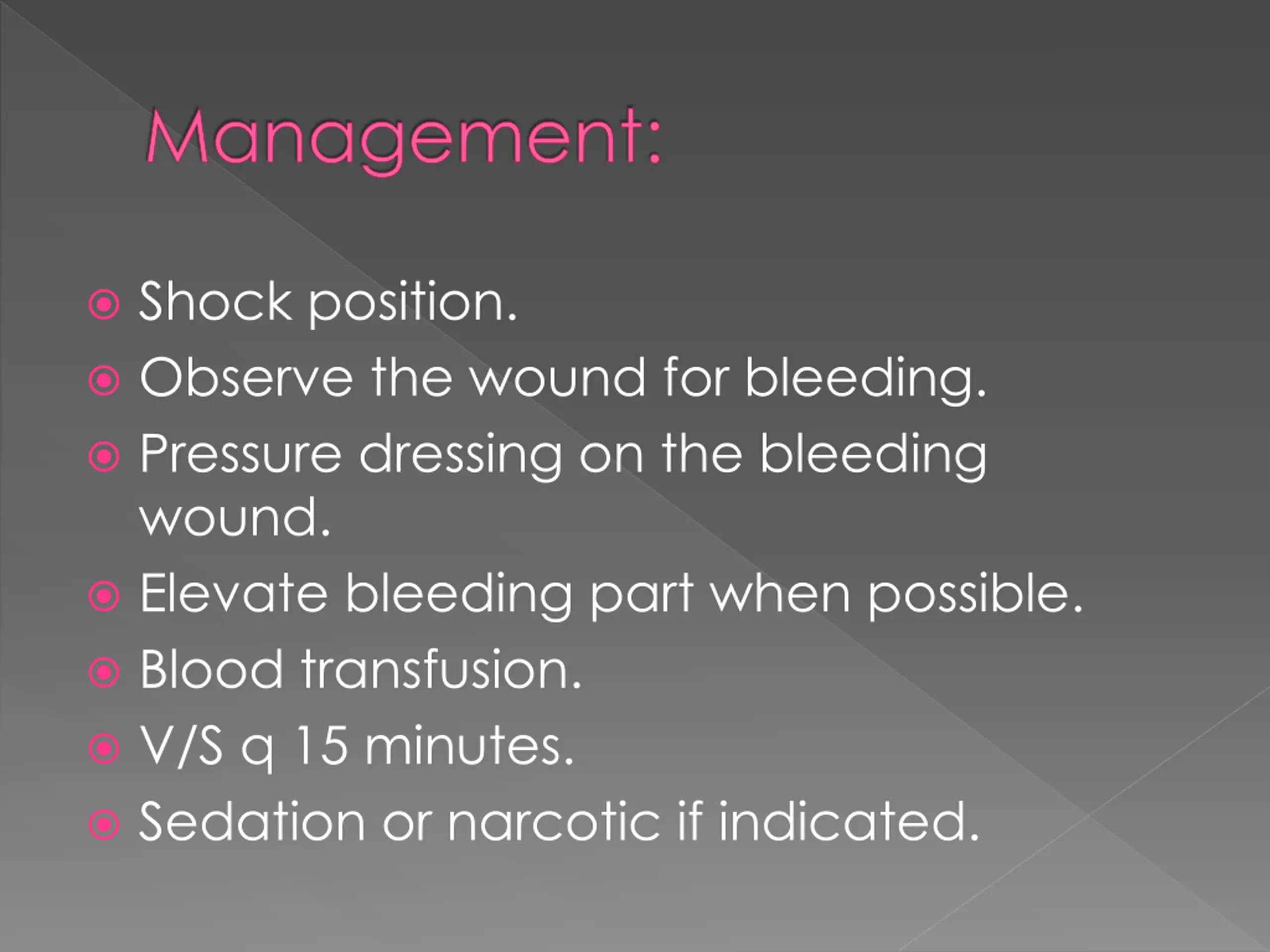 Management: Shock position. Observe the wound for bleeding. Pressure dressing on the bleeding wound. Elevate bleeding part when possible. Blood transfusion. V/S q 15 minutes. Sedation or narcotic if indicated.