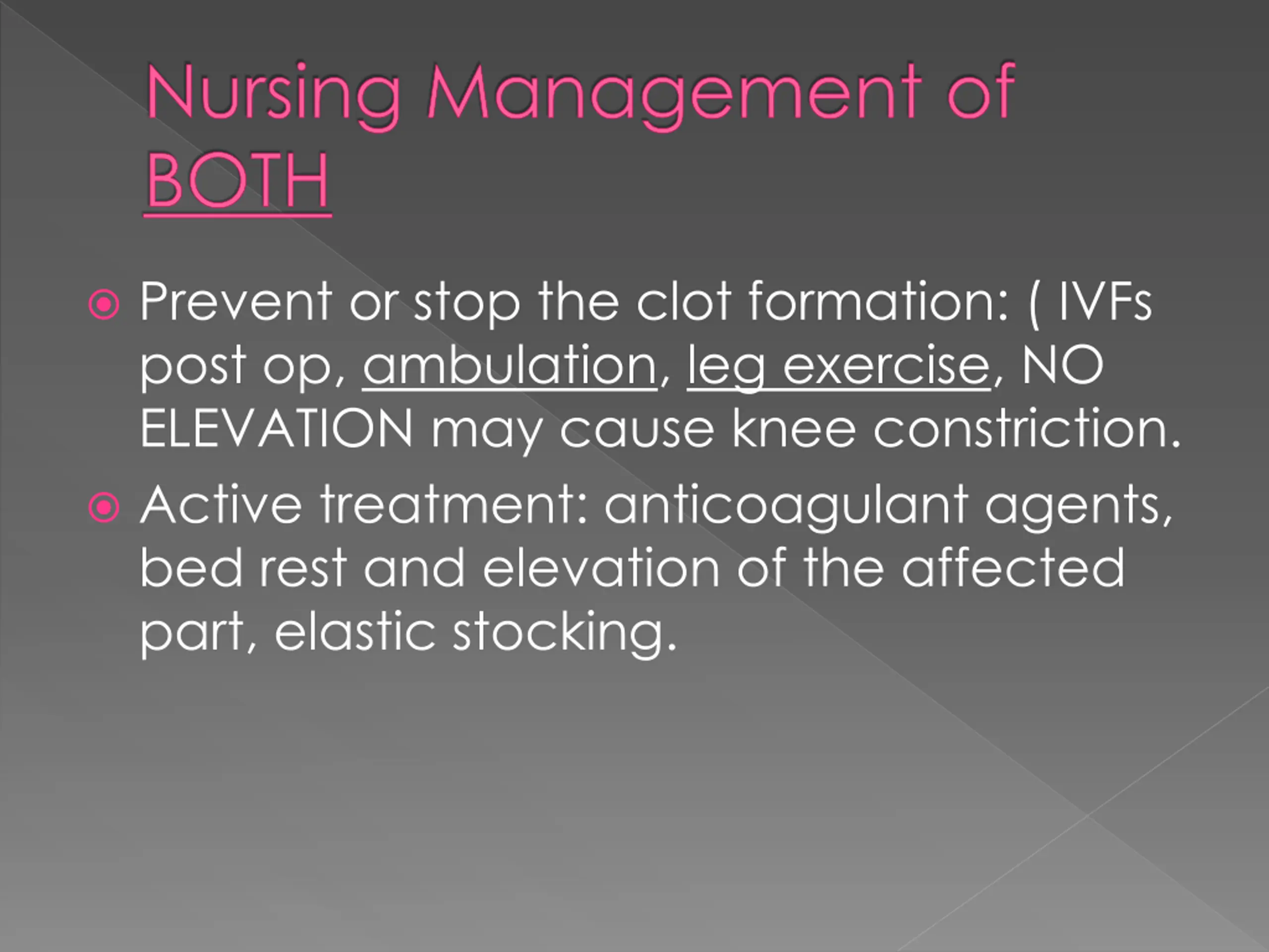 Nursing Management of BOTH Prevent or stop the clot formation: ( IVFs post op, ambulation, leg exercise, NO ELEVATION may cause knee constriction. Active treatment: anticoagulant agents, bed rest and elevation of the affected part, elastic stocking.