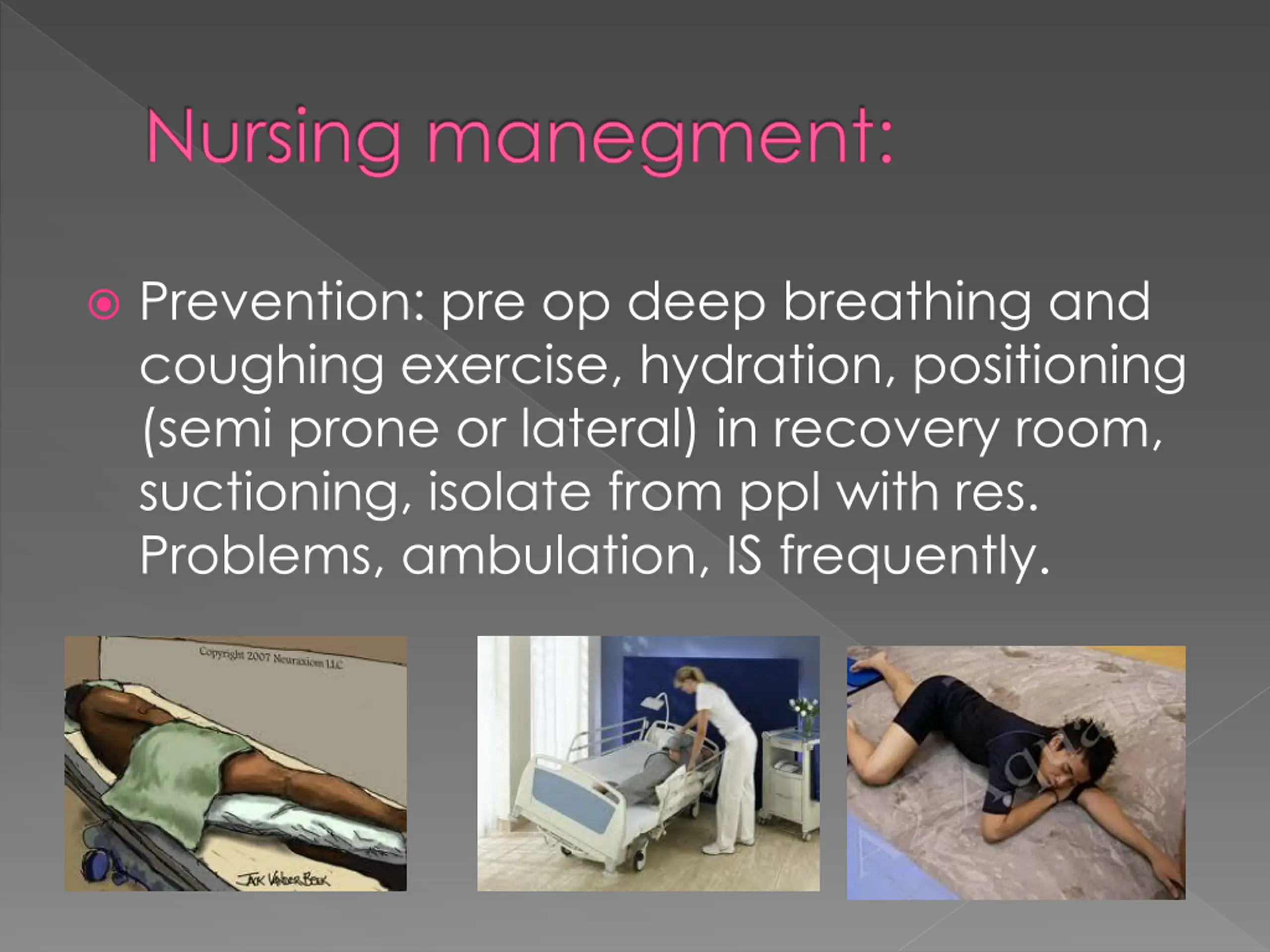 Nursing manegment: Prevention: pre op deep breathing and coughing exercise, hydration, positioning (semi prone or lateral) in recovery room, suctioning, isolate from ppl with res. Problems, ambulation, IS frequently.