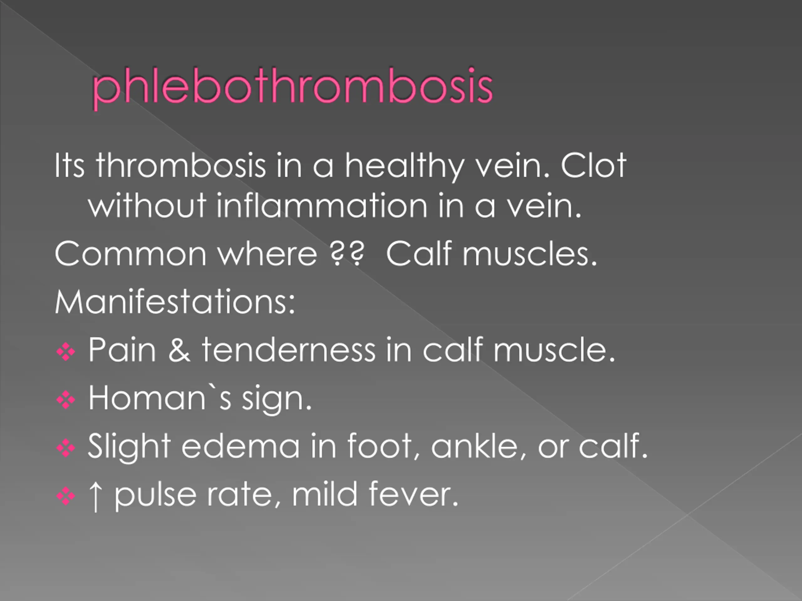 phlebothrombosis Its thrombosis in a healthy vein. Clot without inflammation in a vein. Common where ?? Calf muscles. Manifestations: Pain & tenderness in calf muscle. Homan`s sign. Slight edema in foot, ankle, or calf. pulse rate, mild fever.