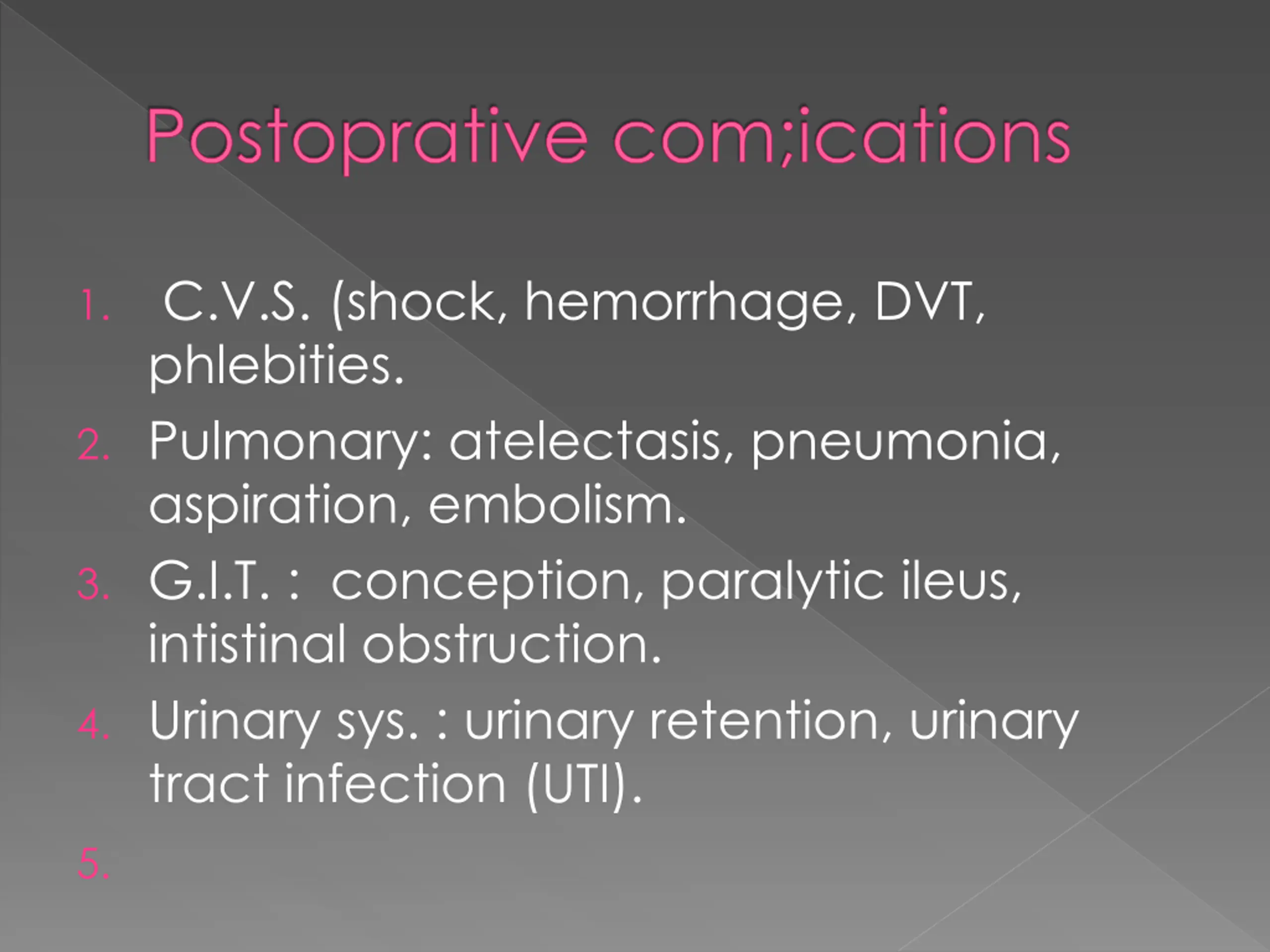 Postoprative com;ications C.V.S. (shock, hemorrhage, DVT, phlebities. 2. Pulmonary: atelectasis, pneumonia, aspiration, embolism. 3. G.I.T. : conception, paralytic ileus, intistinal obstruction. 4. Urinary sys. : urinary retention, urinary tract infection (UTI). 1. 5.