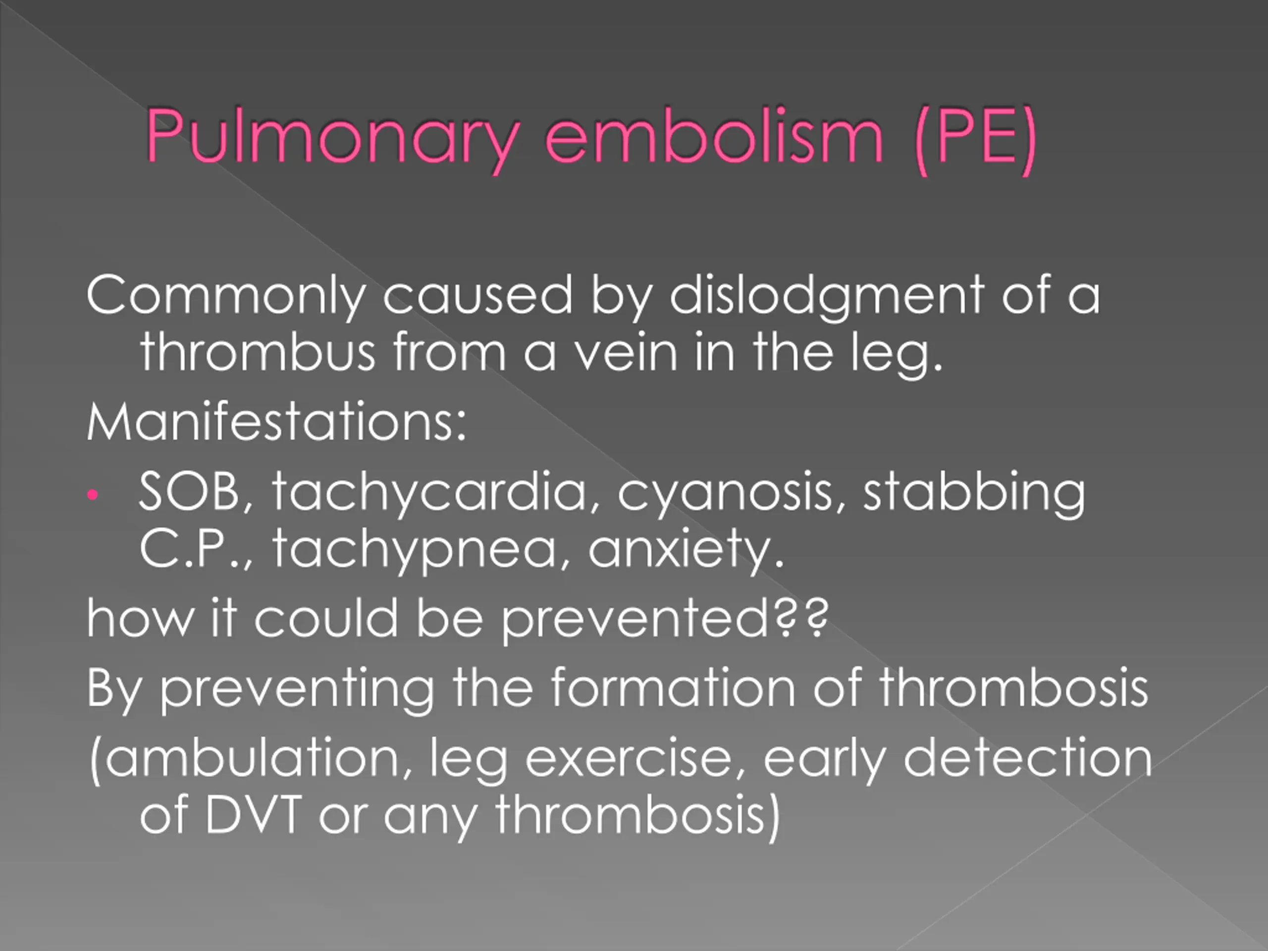 Pulmonary embolism (PE) Commonly caused by dislodgment of a thrombus from a vein in the leg. Manifestations: SOB, tachycardia, cyanosis, stabbing C.P., tachypnea, anxiety. how it could be prevented?? By preventing the formation of thrombosis (ambulation, leg exercise, early detection of DVT or any thrombosis)
