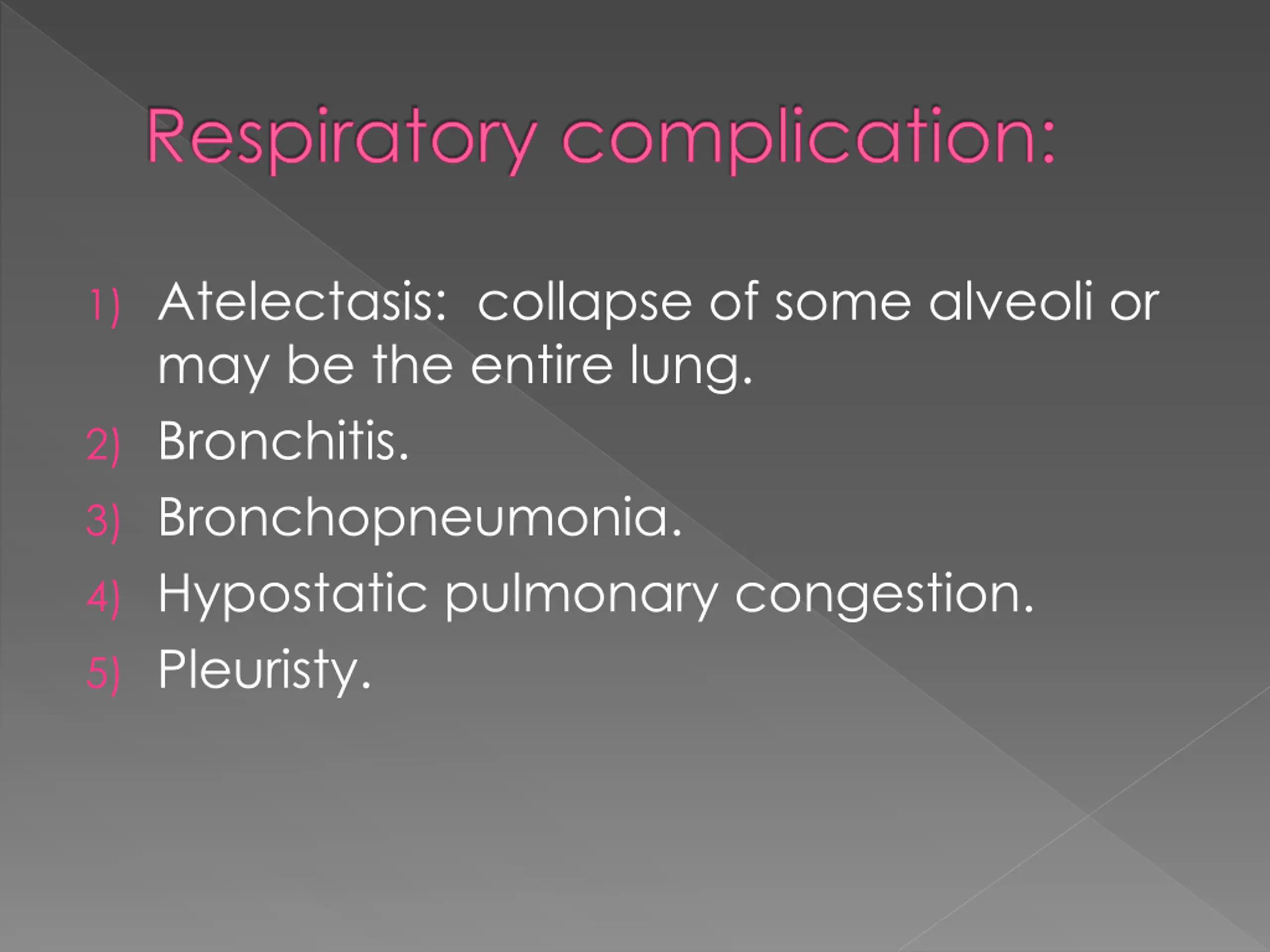 Respiratory complication: 1) Atelectasis: collapse of some alveoli or may be the entire lung. 2) Bronchitis. 3) Bronchopneumonia. 4) Hypostatic pulmonary congestion. 5) Pleuristy.