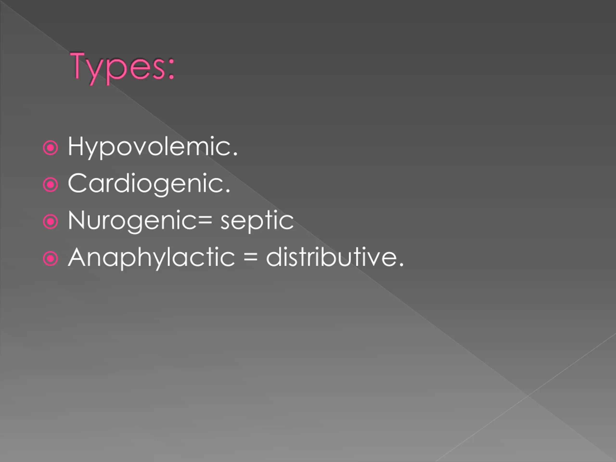 Types: Hypovolemic. Cardiogenic. Nurogenic= septic Anaphylactic = distributive.
