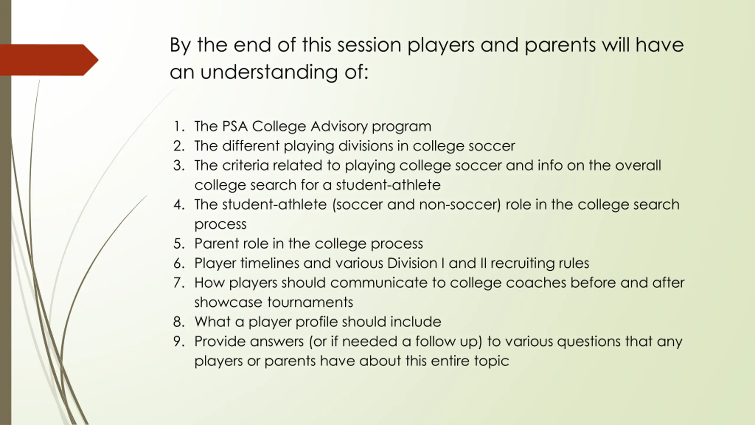 By the end of this session players and parents will have an understanding of: 1. The PSA College Advisory program 2. The different playing divisions in college soccer 3. The criteria related to playing college soccer and info on the overall college search for a student-athlete 4. The student-athlete (soccer and non-soccer) role in the college search process 5. Parent role in the college process 6. Player timelines and various Division I and II recruiting rules 7. How players should communicate to college coaches before and after showcase tournaments 8. What a player profile should include 9. Provide answers (or if needed a follow up) to various questions that any players or parents have about this entire topic