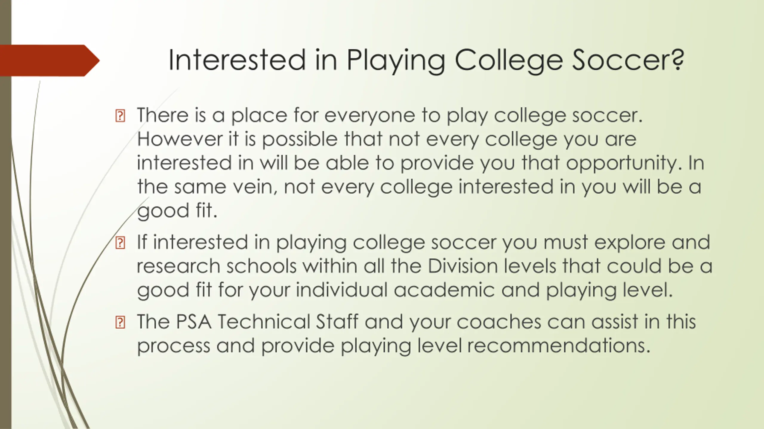 Interested in Playing College Soccer? ? There is a place for everyone to play college soccer. However it is possible that not every college you are interested in will be able to provide you that opportunity. In the same vein, not every college interested in you will be a good fit. ? If interested in playing college soccer you must explore and research schools within all the Division levels that could be a good fit for your individual academic and playing level. ? The PSA Technical Staff and your coaches can assist in this process and provide playing level recommendations.