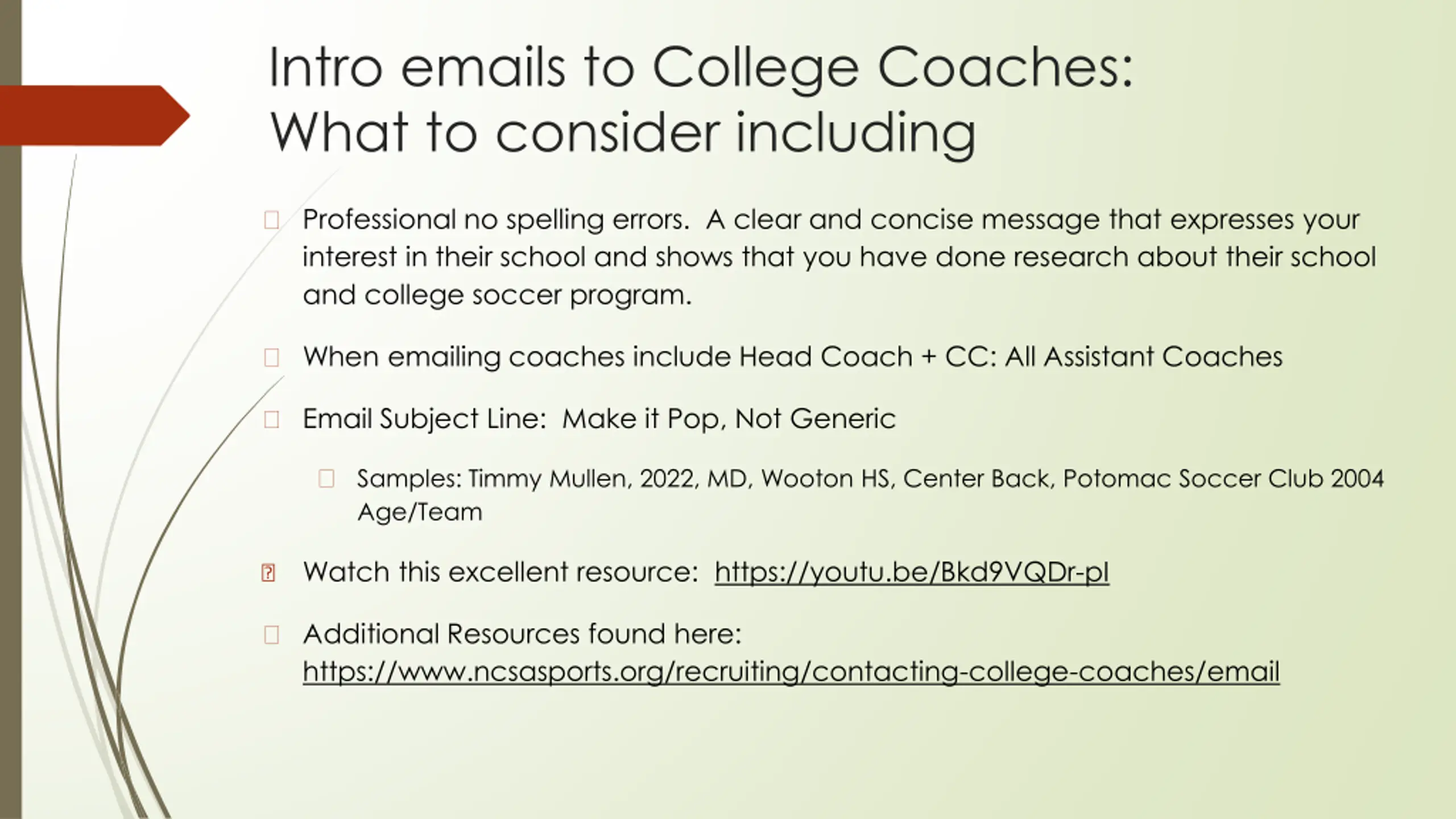 Intro emails to College Coaches: What to consider including ? Professional no spelling errors. A clear and concise message that expresses your interest in their school and shows that you have done research about their school and college soccer program. ? When emailing coaches include Head Coach + CC: All Assistant Coaches ? Email Subject Line: Make it Pop, Not Generic ? Samples: Timmy Mullen, 2022, MD, Wooton HS, Center Back, Potomac Soccer Club 2004 Age/Team Watch this excellent resource: https://youtu.be/Bkd9VQDr-pI ? ? Additional Resources found here: https://www.ncsasports.org/recruiting/contacting-college-coaches/email