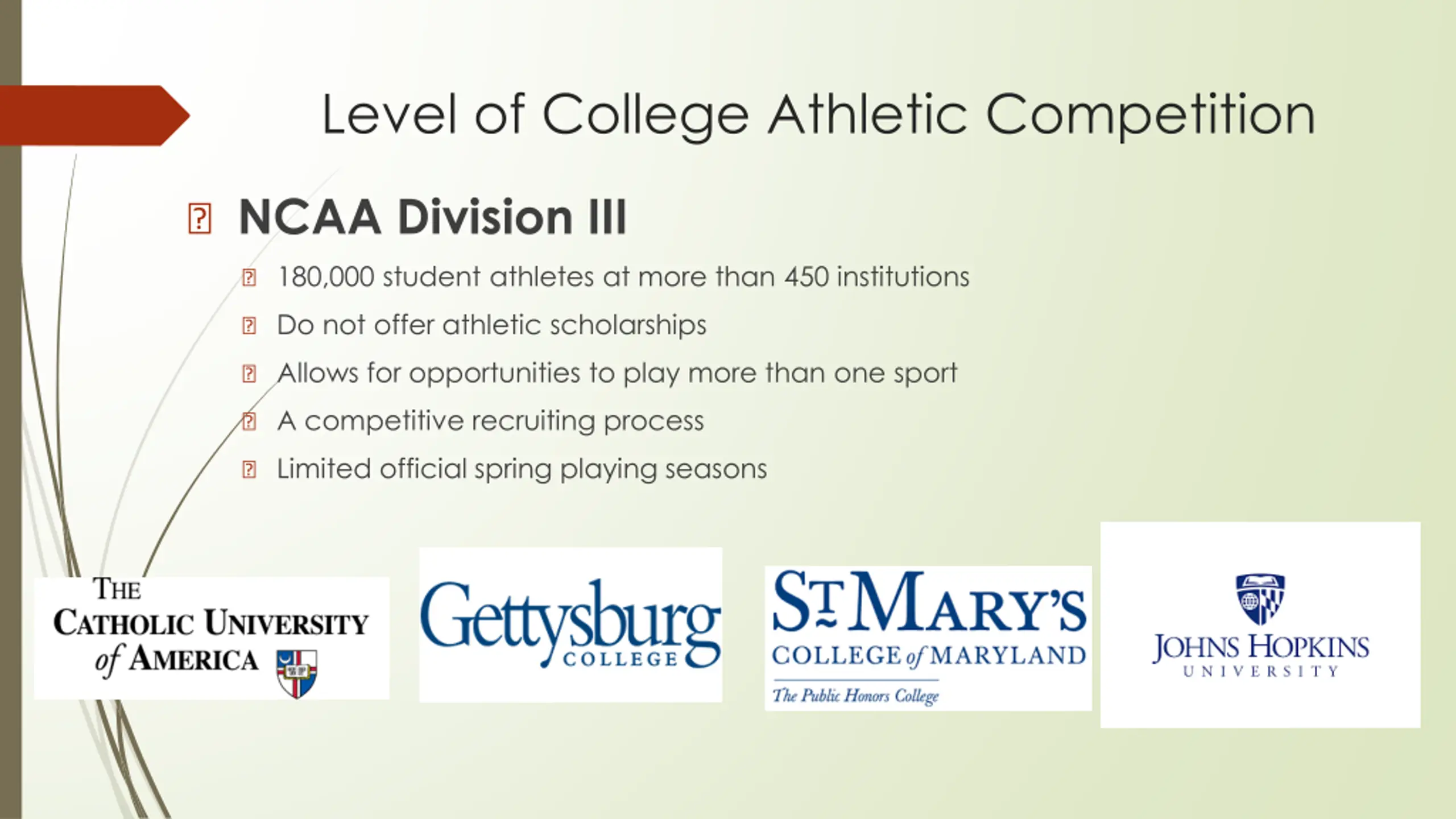 Level of College Athletic Competition ? NCAA Division III ? 180,000 student athletes at more than 450 institutions ? Do not offer athletic scholarships ? Allows for opportunities to play more than one sport ? A competitive recruiting process ? Limited official spring playing seasons