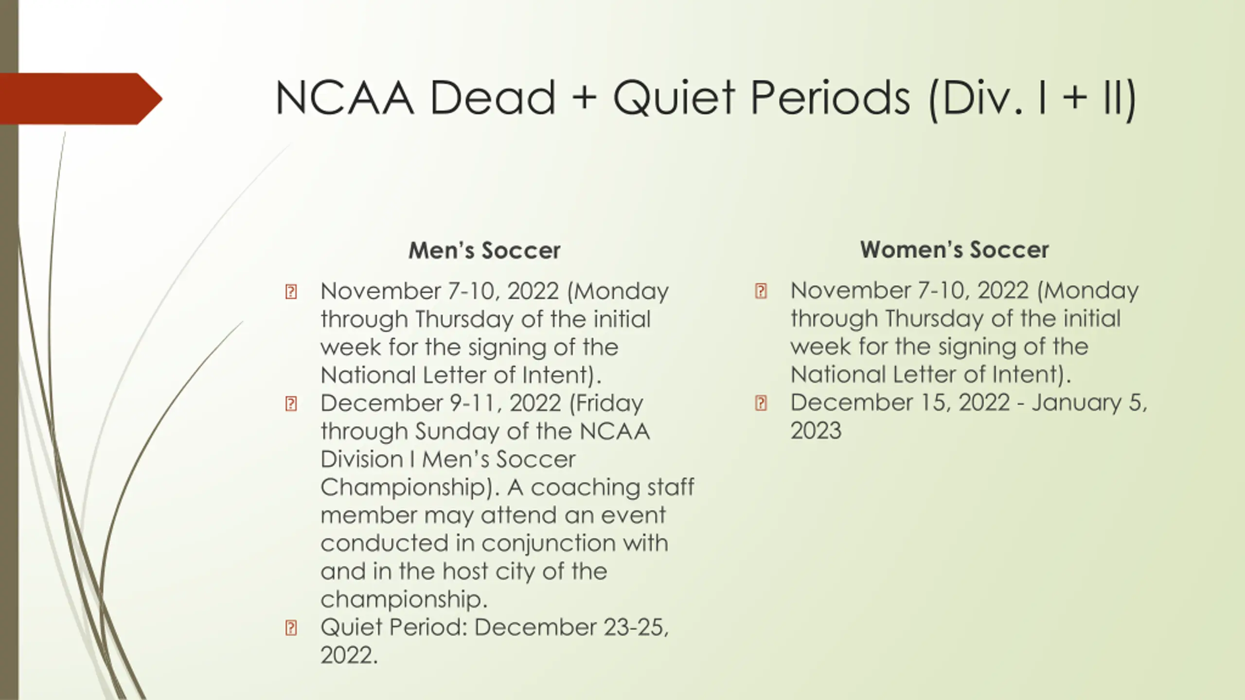NCAA Dead + Quiet Periods (Div. I + II) Women s Soccer Men s Soccer November 7-10, 2022 (Monday through Thursday of the initial week for the signing of the National Letter of Intent). December 15, 2022 - January 5, 2023 November 7-10, 2022 (Monday through Thursday of the initial week for the signing of the National Letter of Intent). December 9-11, 2022 (Friday through Sunday of the NCAA Division I Men s Soccer Championship). A coaching staff member may attend an event conducted in conjunction with and in the host city of the championship. Quiet Period: December 23-25, 2022. ? ? ? ? ?