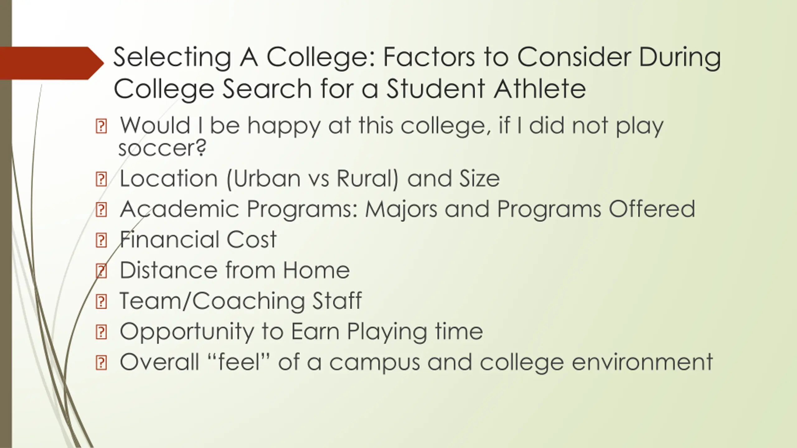 Selecting A College: Factors to Consider During College Search for a Student Athlete ? Would I be happy at this college, if I did not play soccer? ? Location (Urban vs Rural) and Size ? Academic Programs: Majors and Programs Offered ? Financial Cost ? Distance from Home ? Team/Coaching Staff ? Opportunity to Earn Playing time ? Overall feel of a campus and college environment