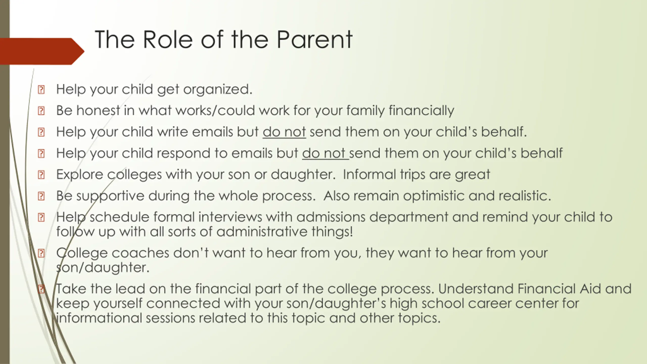 The Role of the Parent ? Help your child get organized. ? Be honest in what works/could work for your family financially ? Help your child write emails but do not send them on your child s behalf. ? Help your child respond to emails but do not send them on your child s behalf ? Explore colleges with your son or daughter. Informal trips are great ? Be supportive during the whole process. Also remain optimistic and realistic. ? Help schedule formal interviews with admissions department and remind your child to follow up with all sorts of administrative things! ? College coaches don t want to hear from you, they want to hear from your son/daughter. ? Take the lead on the financial part of the college process. Understand Financial Aid and keep yourself connected with your son/daughter s high school career center for informational sessions related to this topic and other topics.