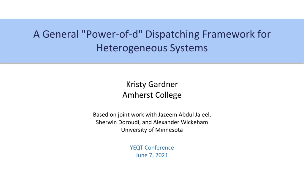 A General "Power-of-d" Dispatching Framework for Heterogeneous Systems Kristy Gardner Amherst College Based on joint work with Jazeem Abdul Jaleel, Sherwin Doroudi, and Alexander Wickeham University of Minnesota YEQT Conference June 7, 2021